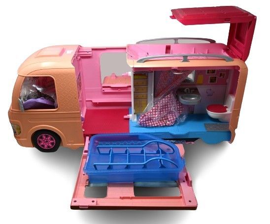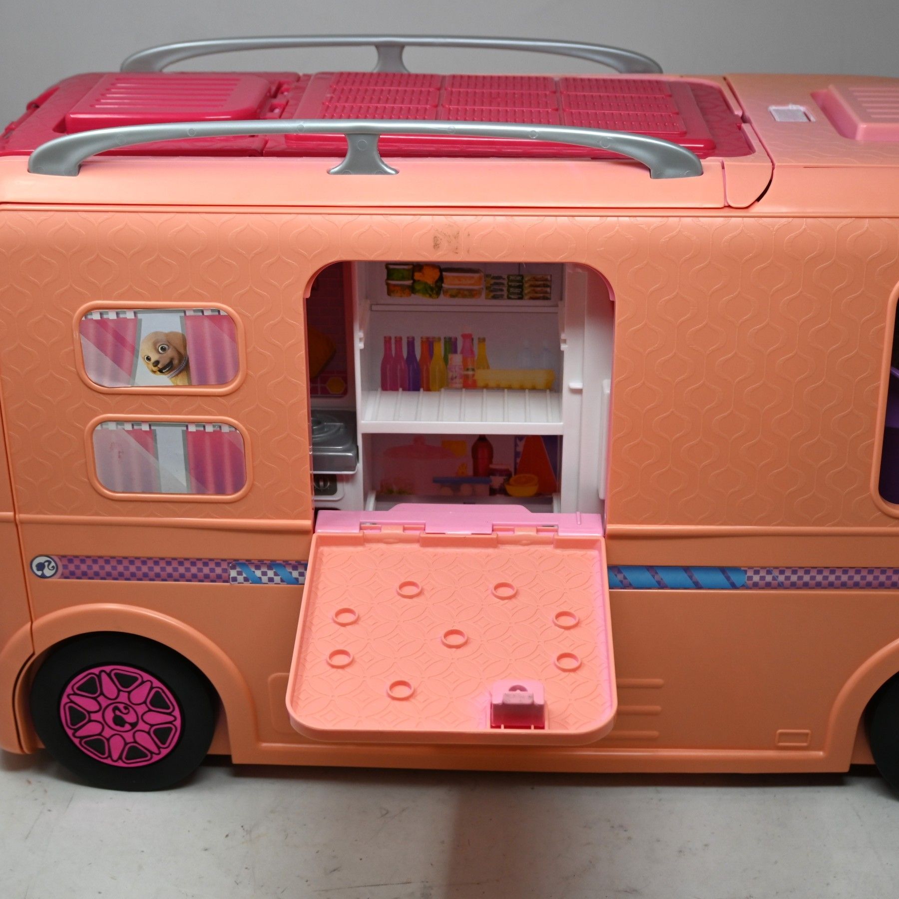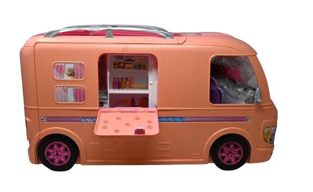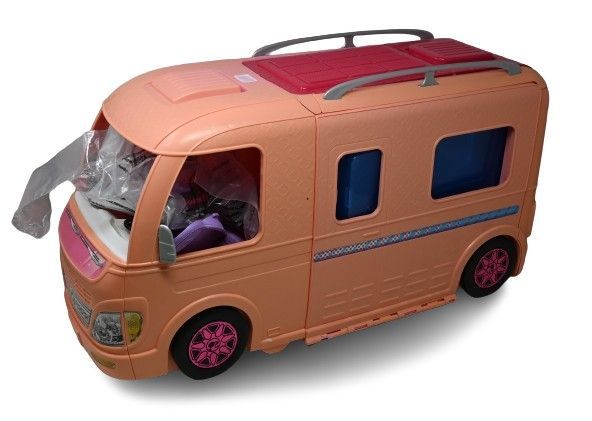 Dieser tolle Barbie-Camper mit richtig rollenden Rädern lässt sich durch eine magische Ausklappfunktion von einem Wohnmobil in ein ca. 60 cm langes Glamping-Spielset mit Schlafplätzen für Barbie und alle ihre Schwestern verwandeln.