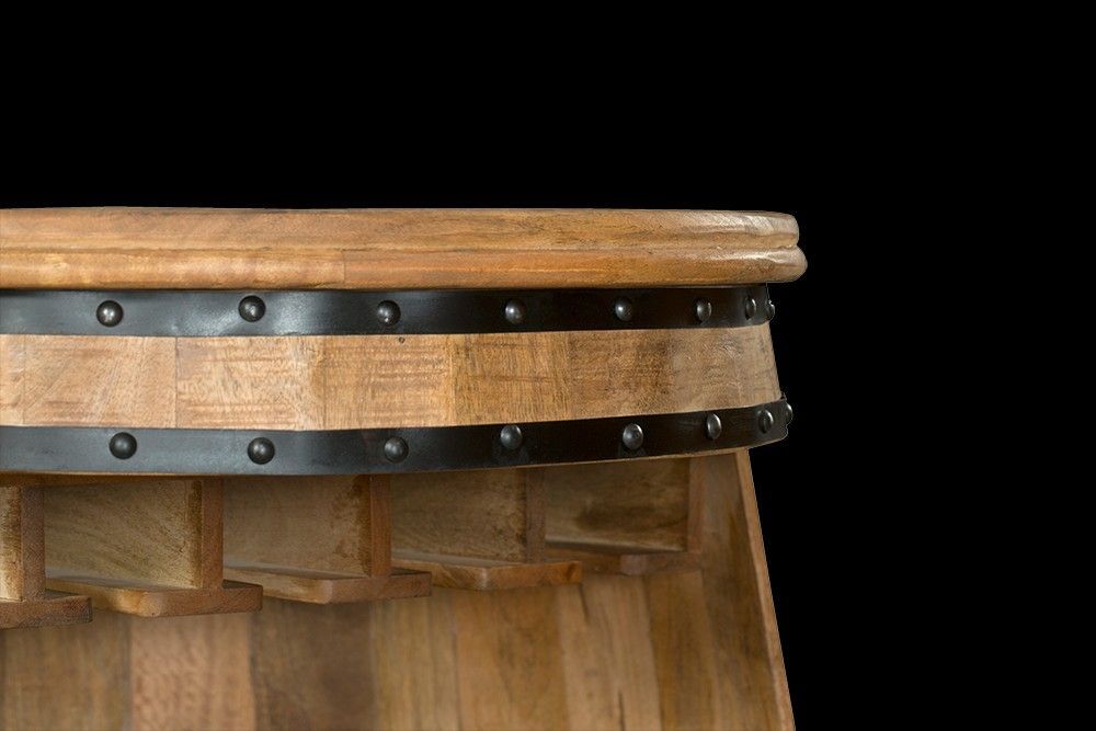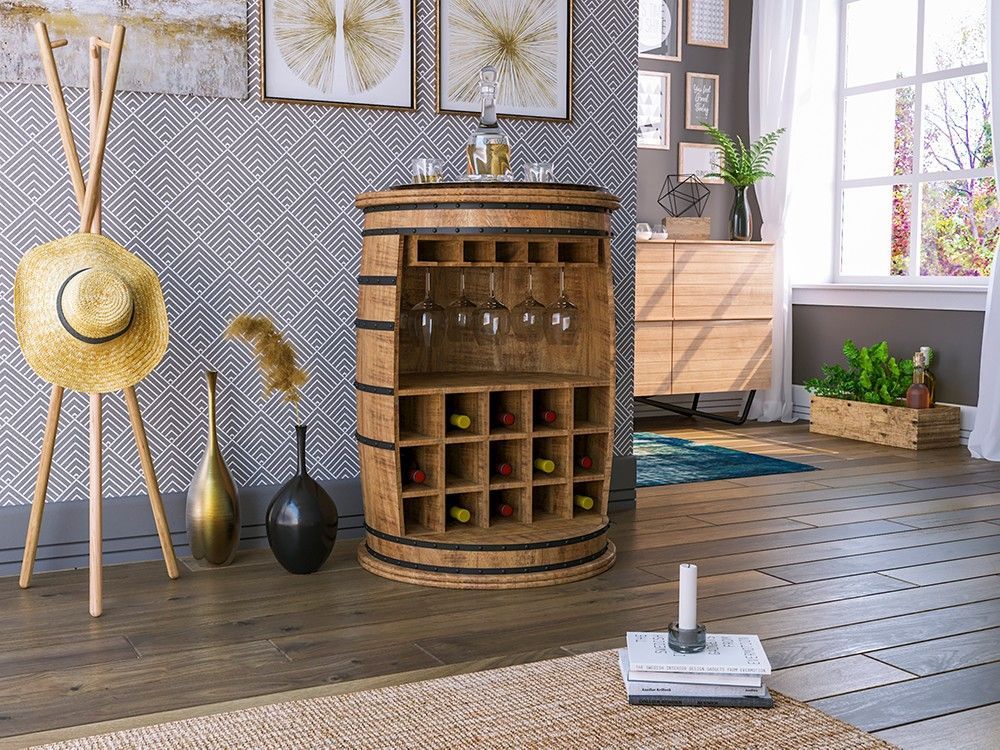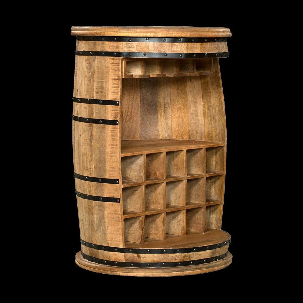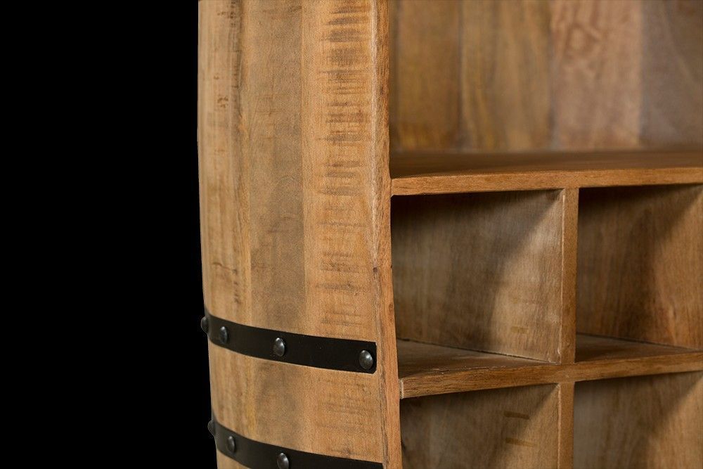 Ein elegantes Weinregal als Fass mit rustikaler Leichtigkeit und Funktionalität Ein stilvolles Wohnaccessoire Die Minibar ist in aufwendiger Handarbeit gefertigt. Hierdurch wird jedes Möbelstück in Verbindung mit dem lackierten Mango Holz und dem Metall ein besonderes Unikat und ein garantierter Bli