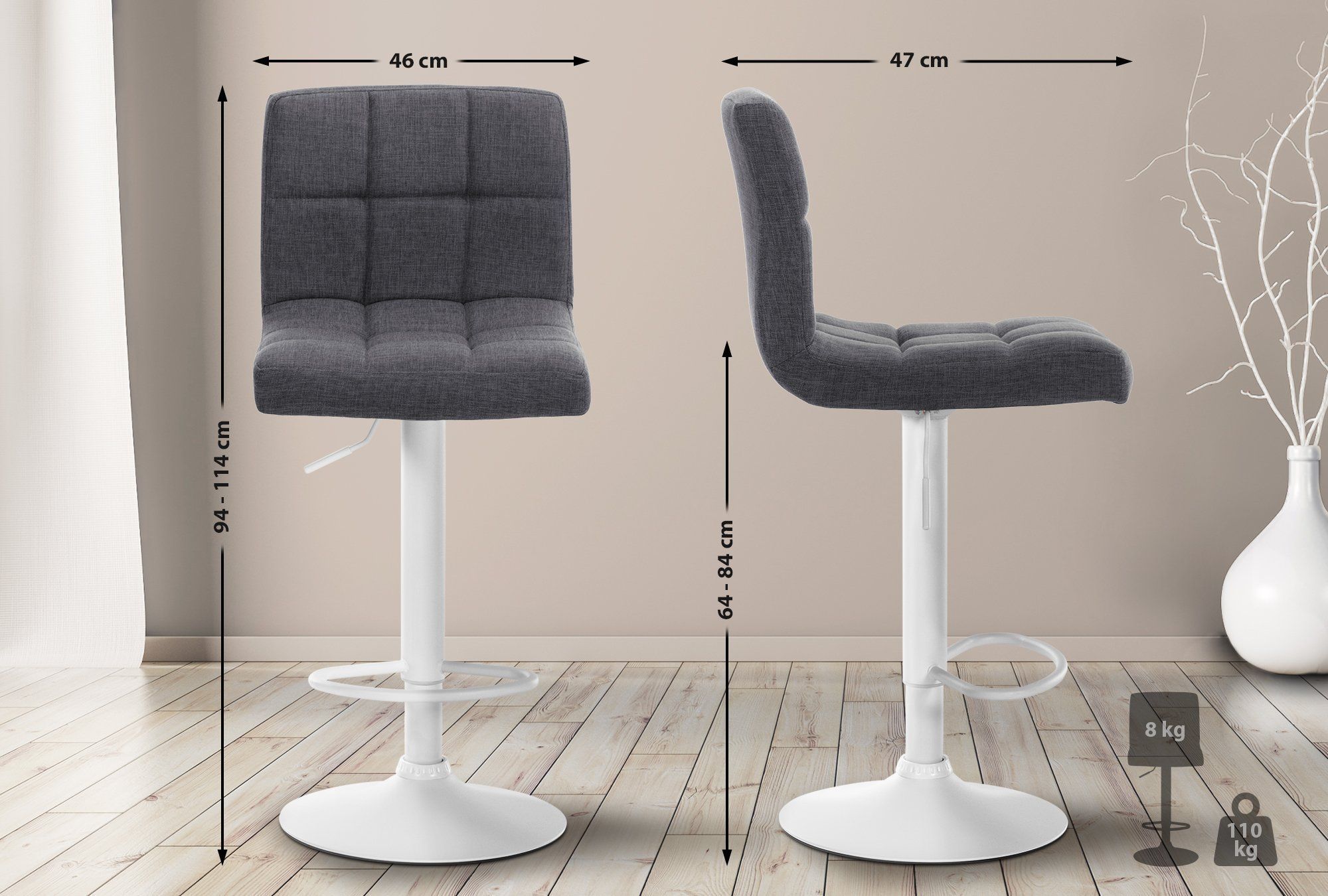 Barhocker MADRID Hellgrau Stoff Weiß Barhocker mit Lehne Barstuhl Tresenhocker
