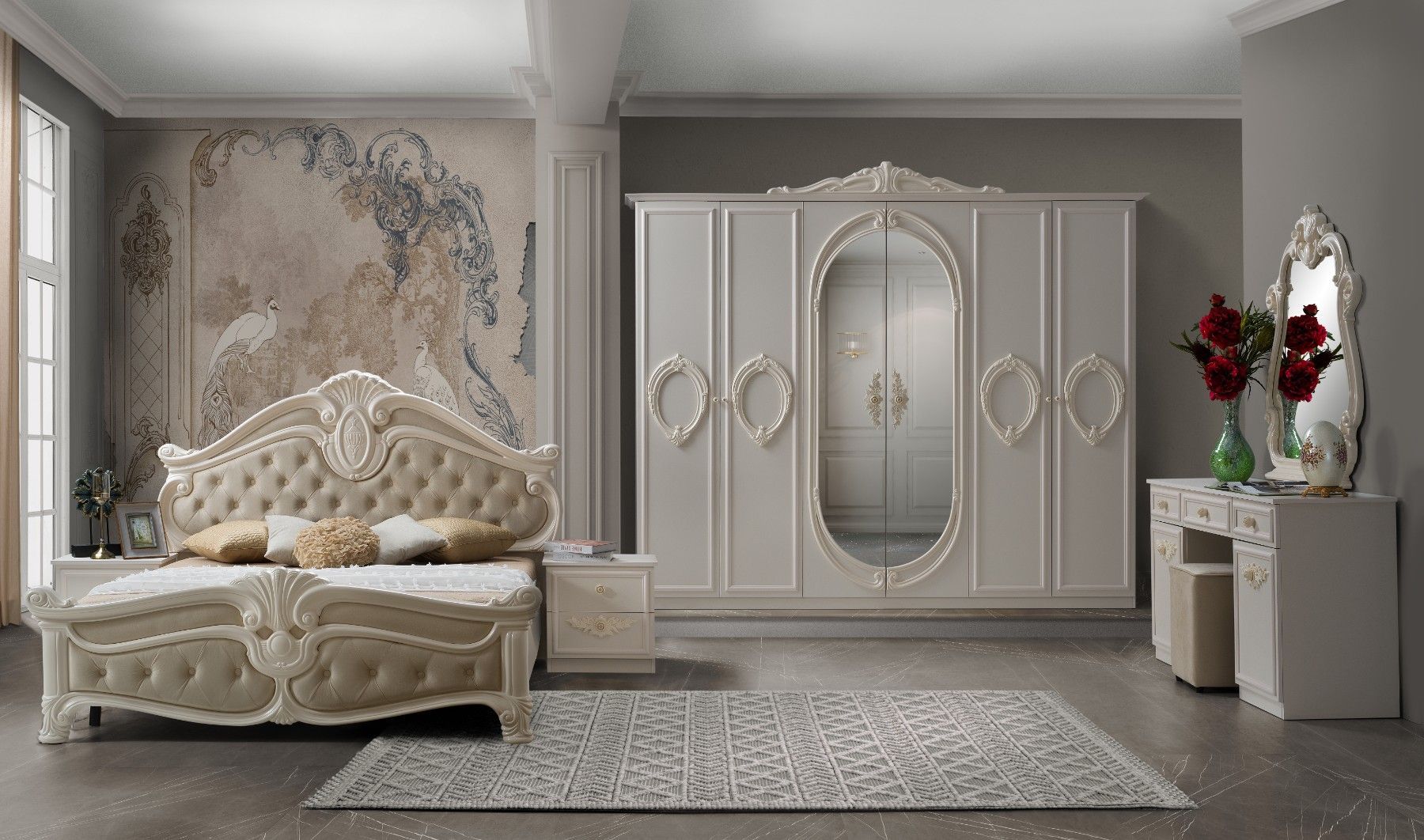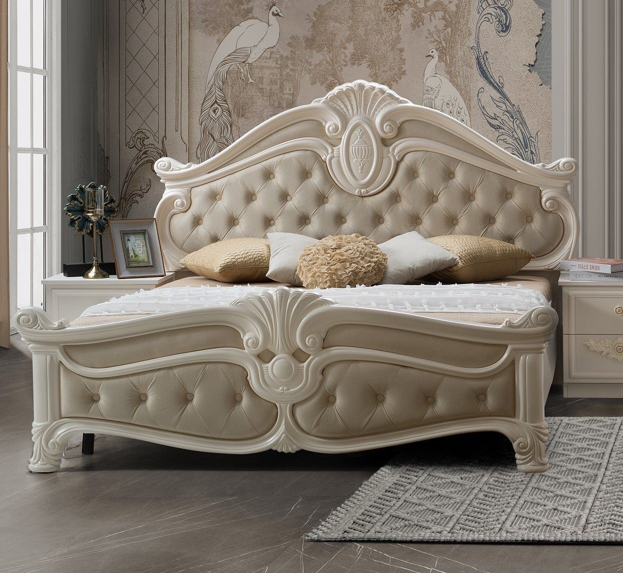 Barock Doppelbett Nora mit Polsterung aus Kunstleder in Weiß / Beige