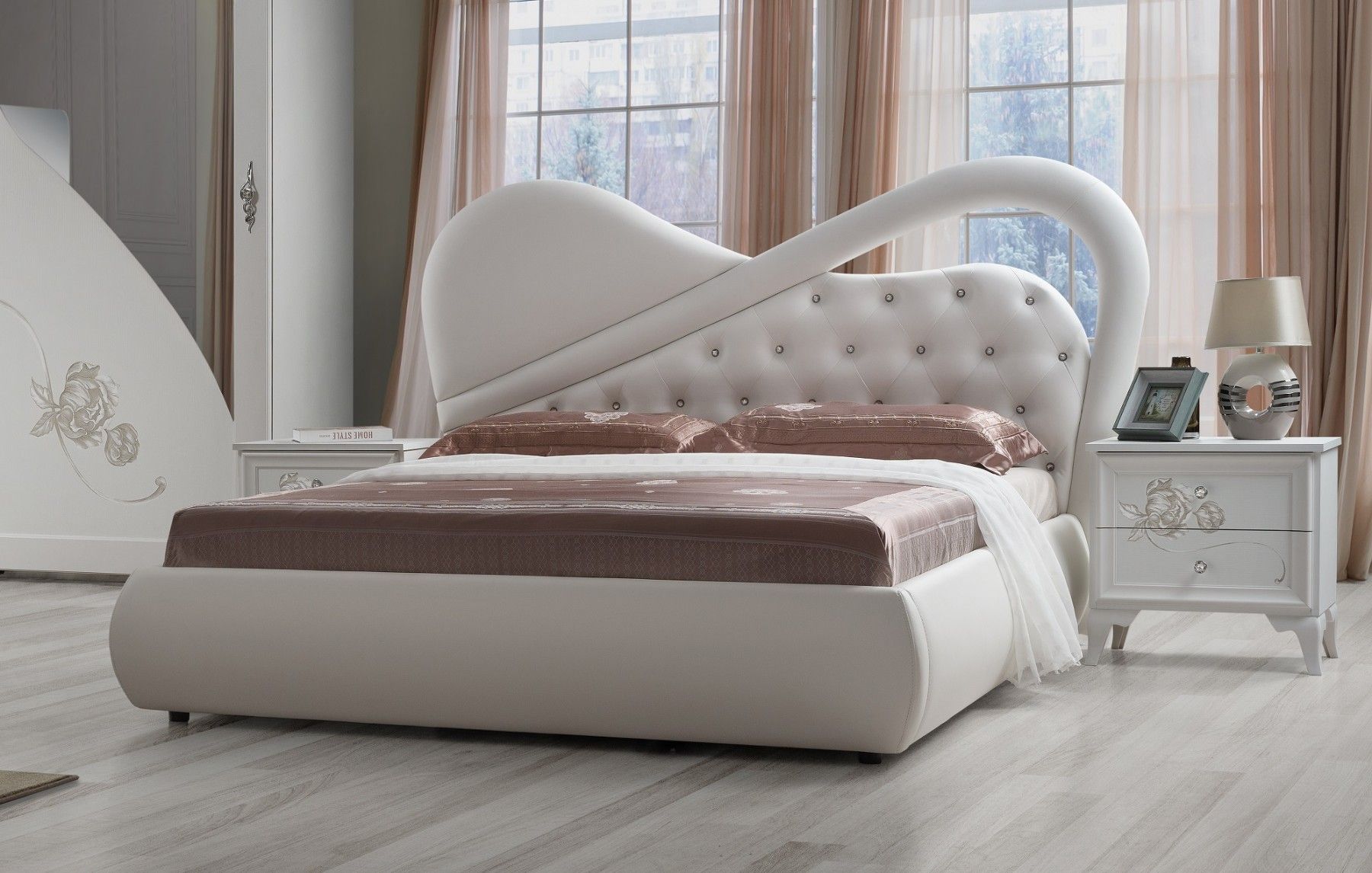 Modernes Bett Peonia 1x Doppelbett 160x190 cm mit aufwändig gearbeiteten Kopfteil- und Fußteil in Hochglanz Liegefläche 160x190 cm B H L: 205 x 127 x 210 cm Strasssteine am Kopfteil Polsterung aus Kunstleder, ca. 5 cm Spanplatte Polsterbezug Stauraum ist Optional. Produktinformation: Farbe: Weiss Ob