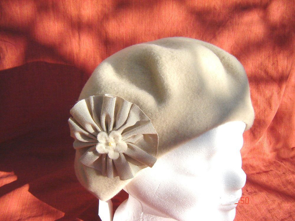 . Damenmütze Baske Baskenmütze Tellermütze in Farbe hell beige große klassische Baskenmützen aus 100% Wolle , Walk , schönes weiches Material verziert mit einer Ripsband Rosette individuell zu tragen , seitlich , nach vorne , nach hinten oder auch den Innenbund nach aussen die Tellergröße ist flach