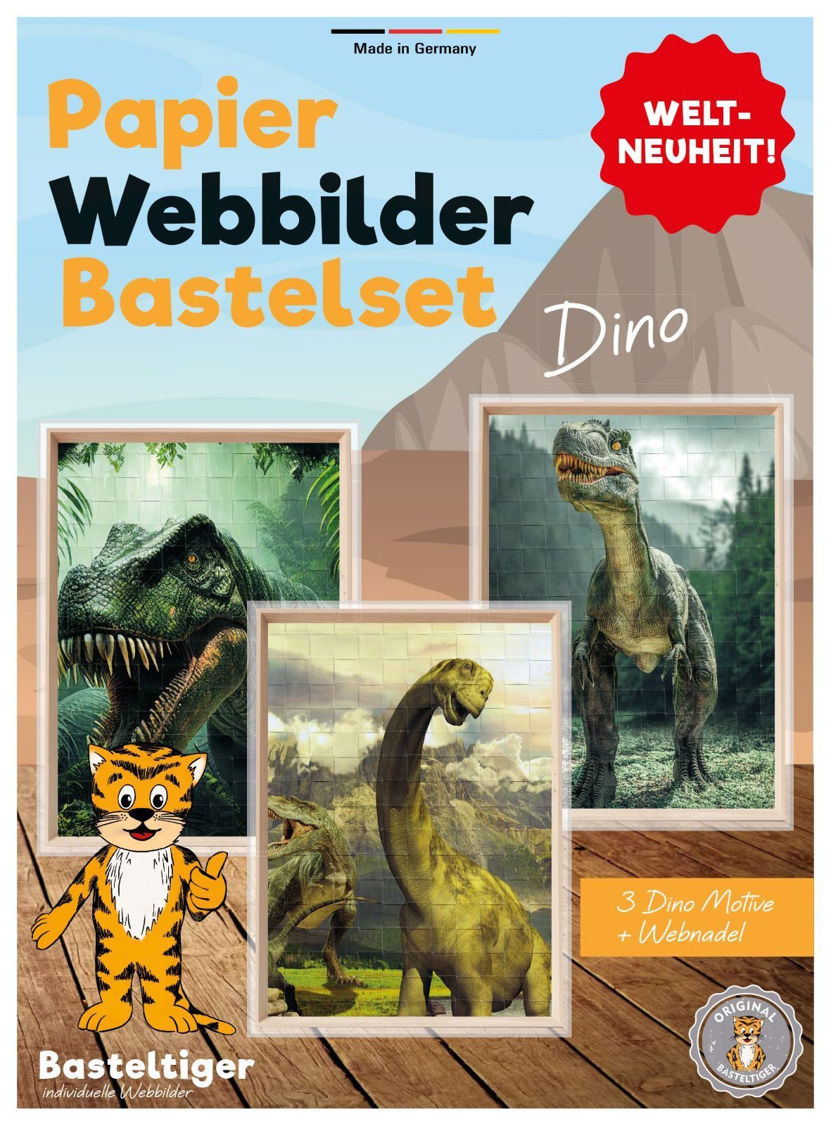 Bastelset Webbilder - Dinos (3 Motive mit Rahmen und Flechtnadel)