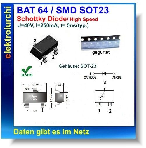 Sie bieten hier auf folgenden Artikel 20 Stück BAT64, Schottky Diode ultraschnell, 40V, 250mA, SMD Code 63 SOT-23, Infineon Ultraschnelle Diode( 50ns) im SOT-23 Gehäuse für High-Speed Anwendungen SMD Marking Code: 63 Spannung: 40V Strom: 250mA t= 5ns Hersteller: Infineon