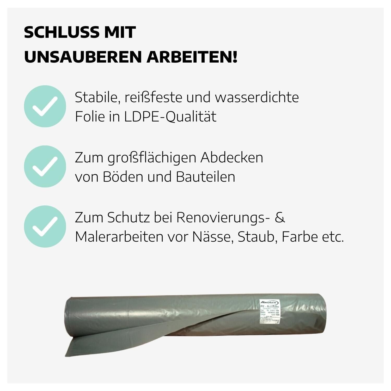 Die Baufolie Abdeckfolie Schutzfolie Typ 200 von Awotex ist die ideale Lösung für den Schutz von Oberflächen während Bauarbeiten oder Renovierungen. Die transluzente Folie ist leicht zu handhaben und misst 4m x 50m. Die Abdeckfolie eignet sich perfekt für den Innen- und Außenbereich und kann vielsei
