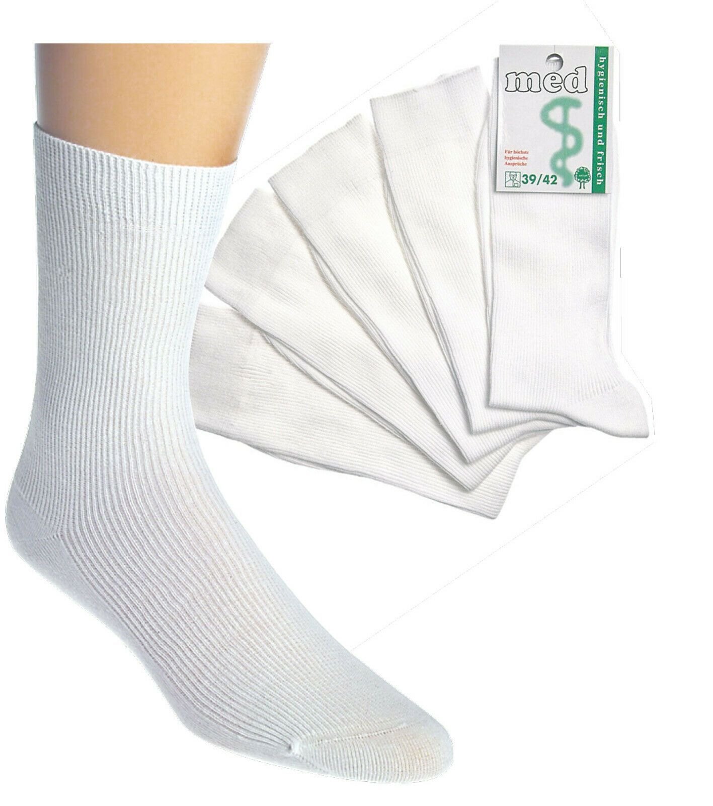 Damen-Arzsocken, weiß im 10er Pack! Der Strumpf ist feingerippt und die Spitze ist handgekettelt. Keine Druckstellen oder lästige Nähte Kochfest! Material: 76% Baumwolle, 24% Polyamid Größe: 35 38, 39 42, 43-46, 47-50