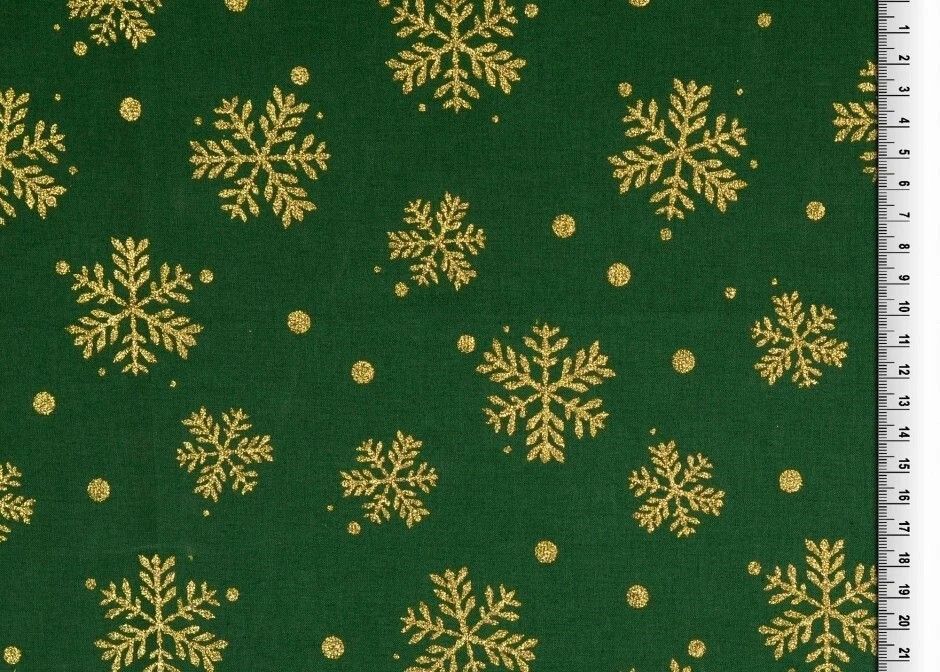 Hochwertiger Baumwolldruck mit Gold -Glitzer Schneekristalle in gold* auf dunkelgrünem Grund *lässt sich schlecht fotografieren, sie glitzern intensiv ! 100 % Baumwolle 140 cm breit Gewicht: ca. 120 g qm Meterware Abgabe in 50-cm-Schritten Für den Festpreis von EUR 7,00 erhalten Sie 0,5 lfd Meter be