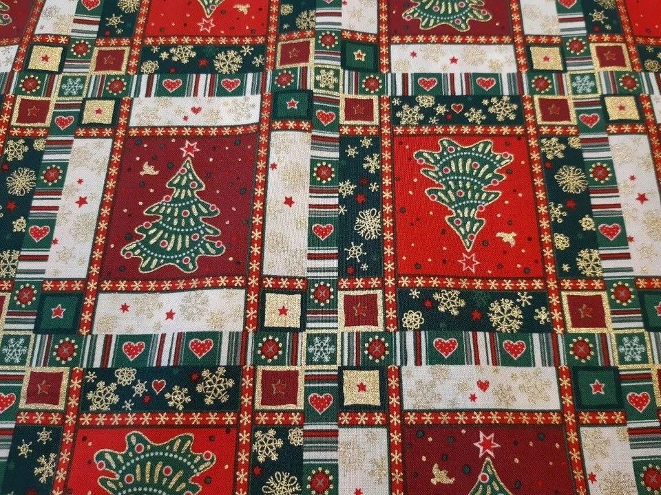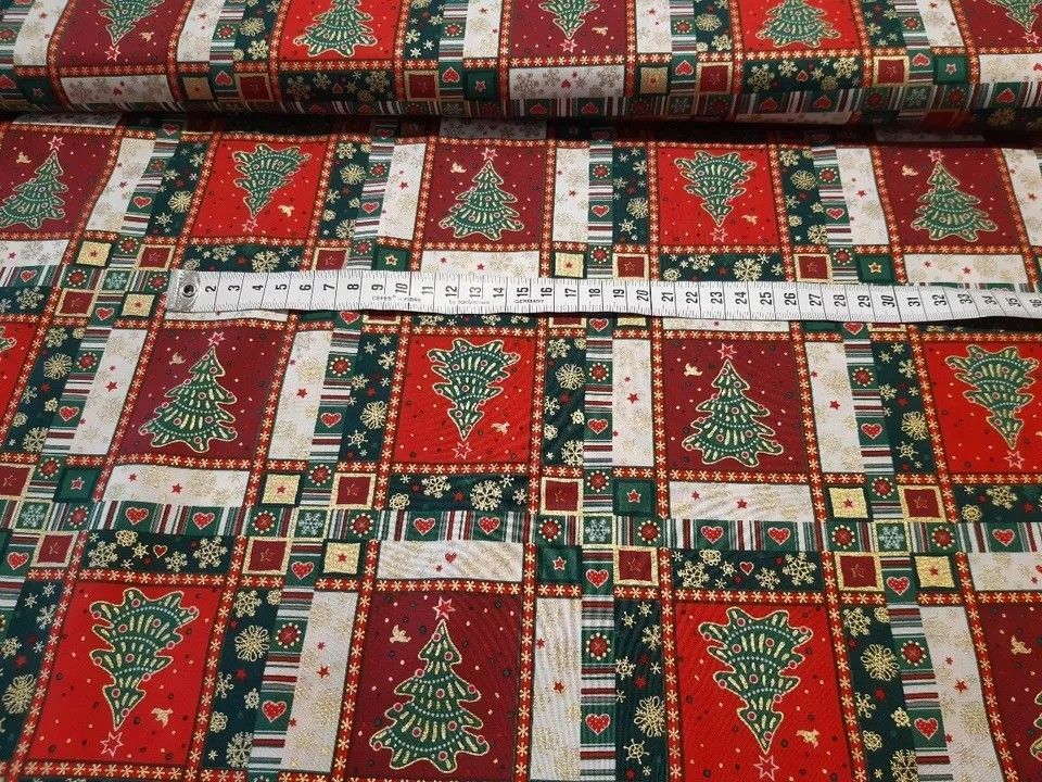Hochwertiger Baumwolldruck mit Gold -Glitzer Tannenbäume Patchworkdruck mit Tannenbäumen, kleinenHerzchen, Sterne und anderen Motiven rot-dunkelrot-grün-dunkelgrün-weiß-goldfarben 100 % Baumwolle 140 cm breit Gewicht: ca. 110 g qm Meterware Abgabe in 50-cm-Schritten Für den Festpreis von EUR 7,00 er