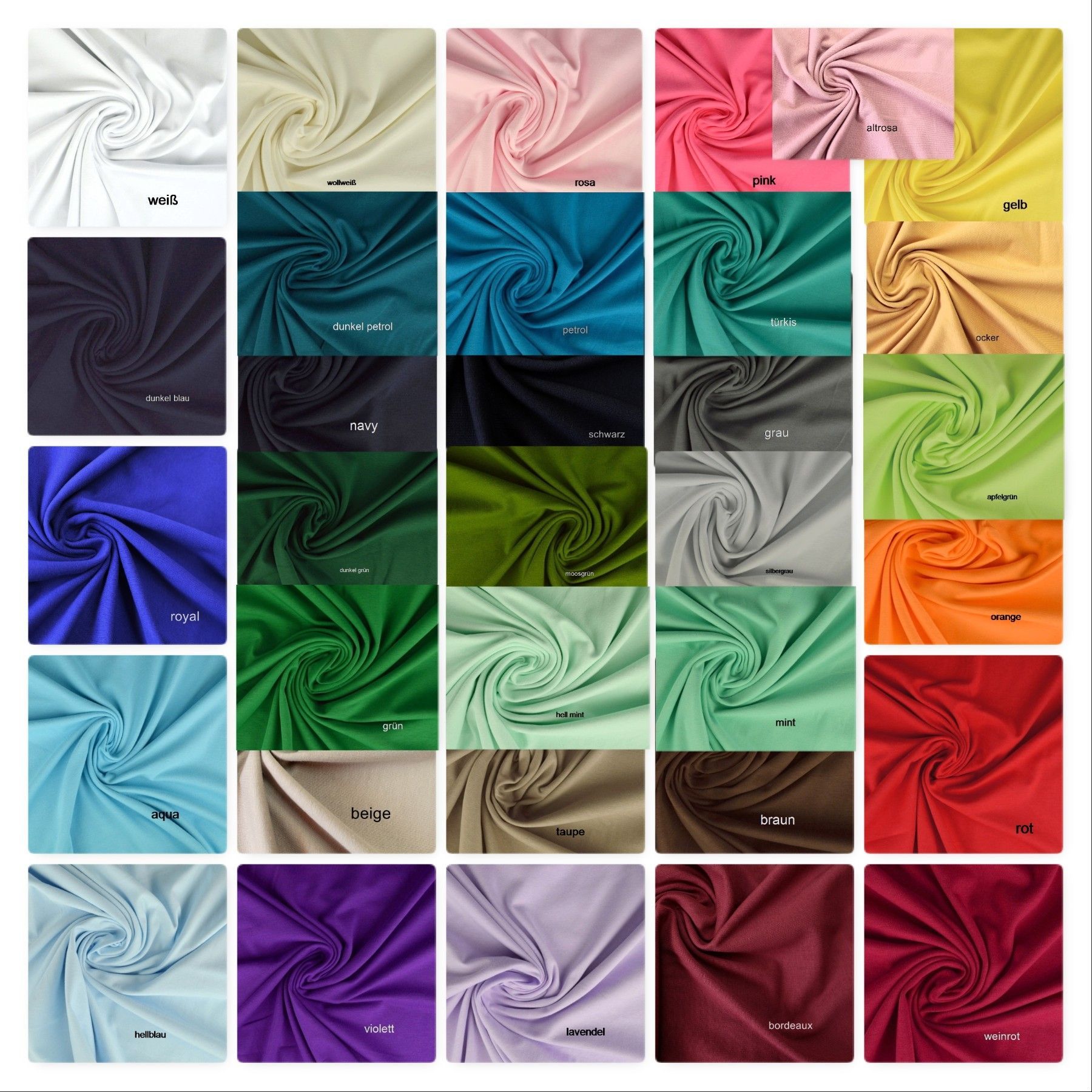 weiß, rosa, altrosa, ocker, orange, weinrot, bordeaux, violett, hellblau, royal, dunkelblau, navy, petrol, türkis, mint, apfelgrün, grün