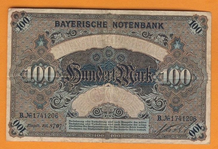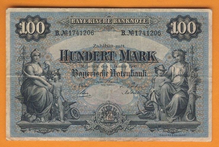 Bayerusche Banknote München 1. Januar 1900 100 Mark Scheinnummer B Nr. 1741206