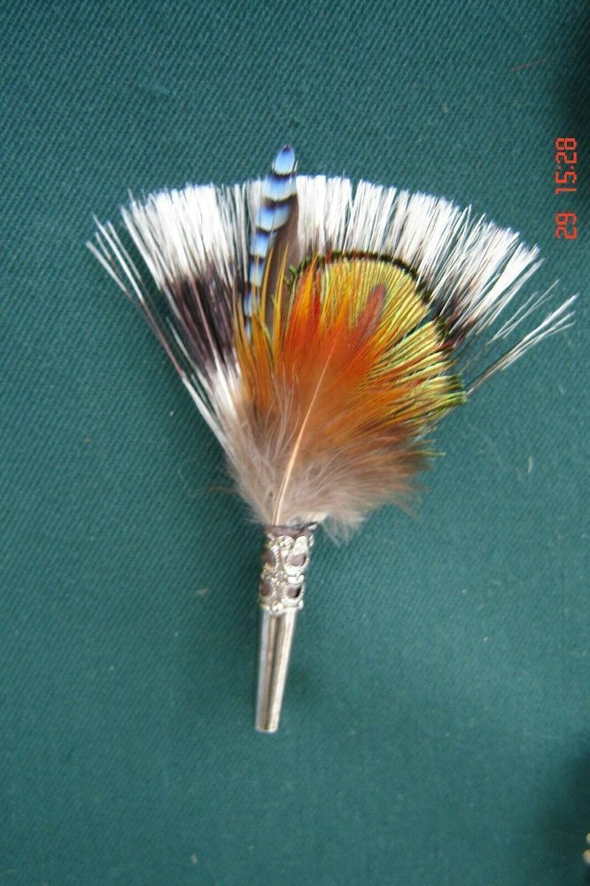 . Hutschmuck , Hutfeder die Geschenkidee für den Hutträger klassischer Hutschmuck für Trachtenhut Vereinshut , Schützenhut oder auch für den Wanderhut kleines Bärtchen , wie Dachsbärtchen mit bunter Feder und Hülse filigraner Halter mit Nadel zum Anstecken Gesamthöhe insgesamt ca 8 cm Natürlich werd
