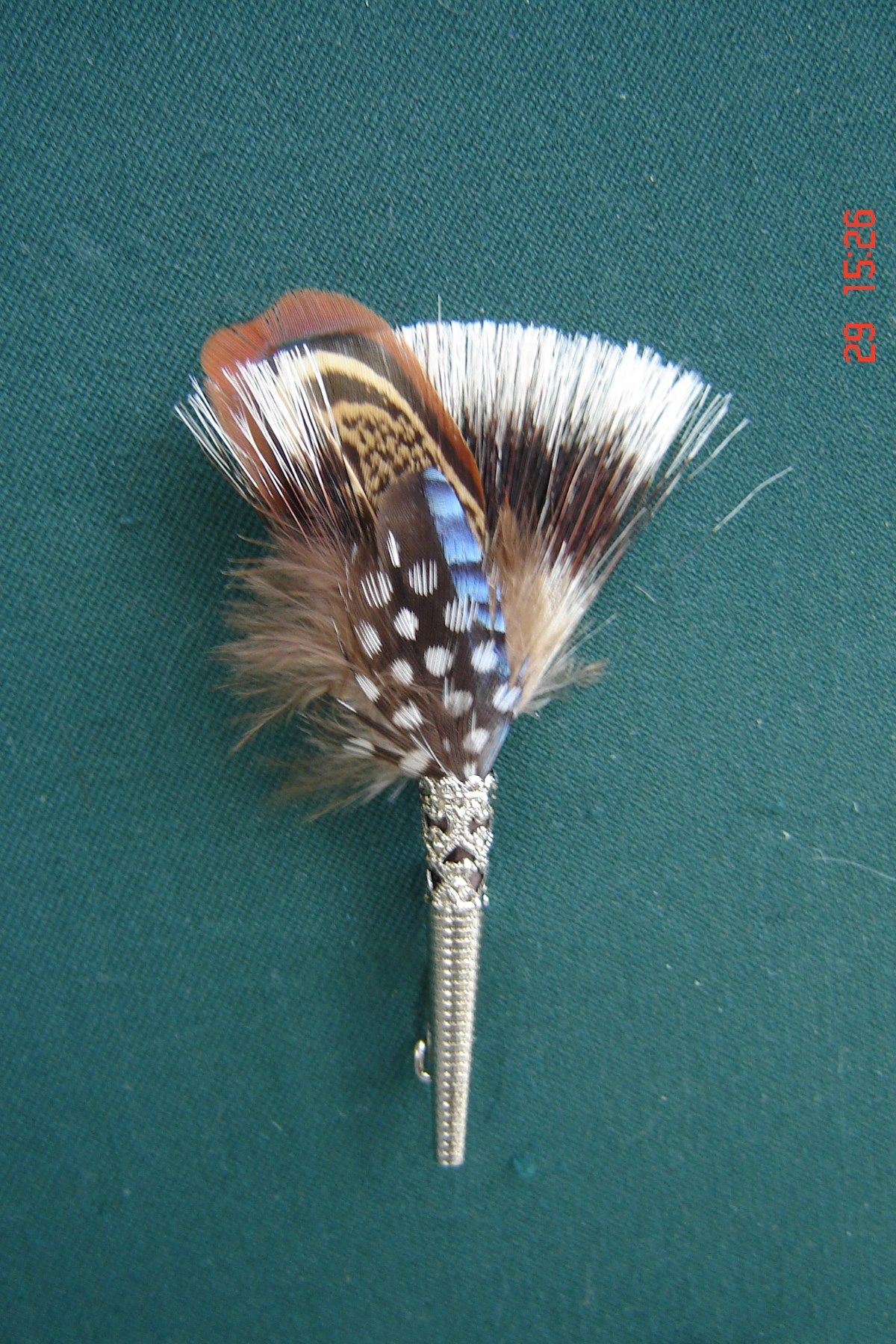 . Hutschmuck , Hutfeder die Geschenkidee für den Hutträger klassischer Hutschmuck für Trachtenhut Vereinshut , Schützenhut oder auch für den Wanderhut kleines Bärtchen , wie Dachsbärtchen mit bunter Feder und Hülse filigraner Halter mit Nadel zum Anstecken Gesamthöhe insgesamt ca 8,5 cm Natürlich we