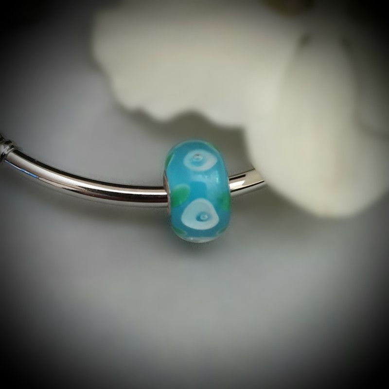 Glasbead mit silberfarbenen Kappen ohne Gewinde, Außendurchmesser ca. 13,8mm, Innendurchmesser ca. 4,5mm. Unsere Glasbeads sind in Handarbeit gefertig und können daher leicht in Farbe, Form und Muster vom Foto abweichen.