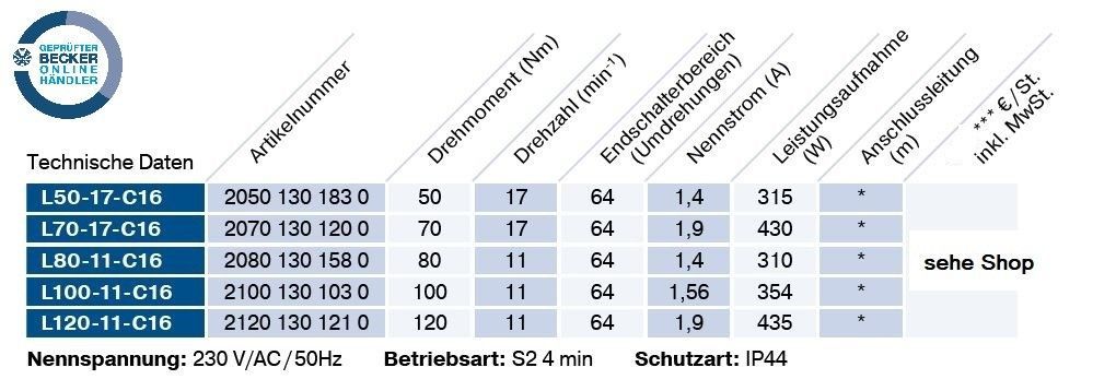 Becker Antrieb für Verrieglungssysteme mit Funk L50-17-C16, 50Nm 17U/ min