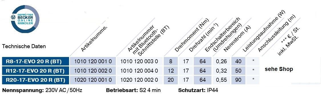 Becker - Rohrantrieb R20-17-EVO 20 R, elektronischer Endabschaltung Evolution-Serie