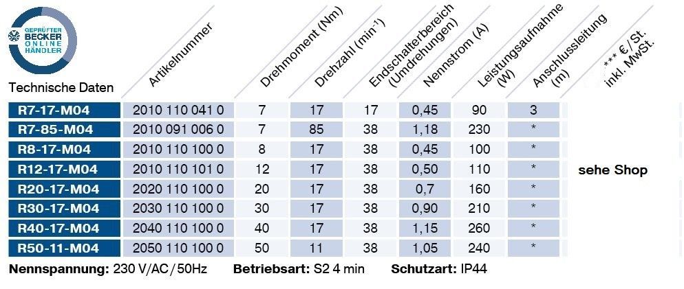 Becker Rohrantrieb R20-17-M04 20Nm 17U/ min ab Ø 50mm