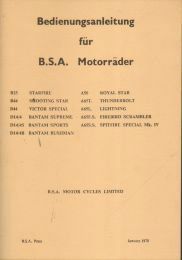 Bedienungsanleitung BSA Motorräder A50 Royal Star, A65 T. Thunderbold, A 65 L. Lightning, A 65 F.S Firebird Scrambler , A 65 S.S Spitfire Special MK. IV B 25 Starfire , B 44 Victor Special, B44 Shooting Star, D14 4 Bantam Supreme, D14 4 S Bantam Sports , D14 4 B BantamBushman Ausgabe Januar 1970 Deu
