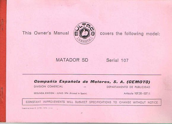 Bedienungsanleitung Bultaco Matador SD/ MK Serial 107, Motorrad, Oldtimer