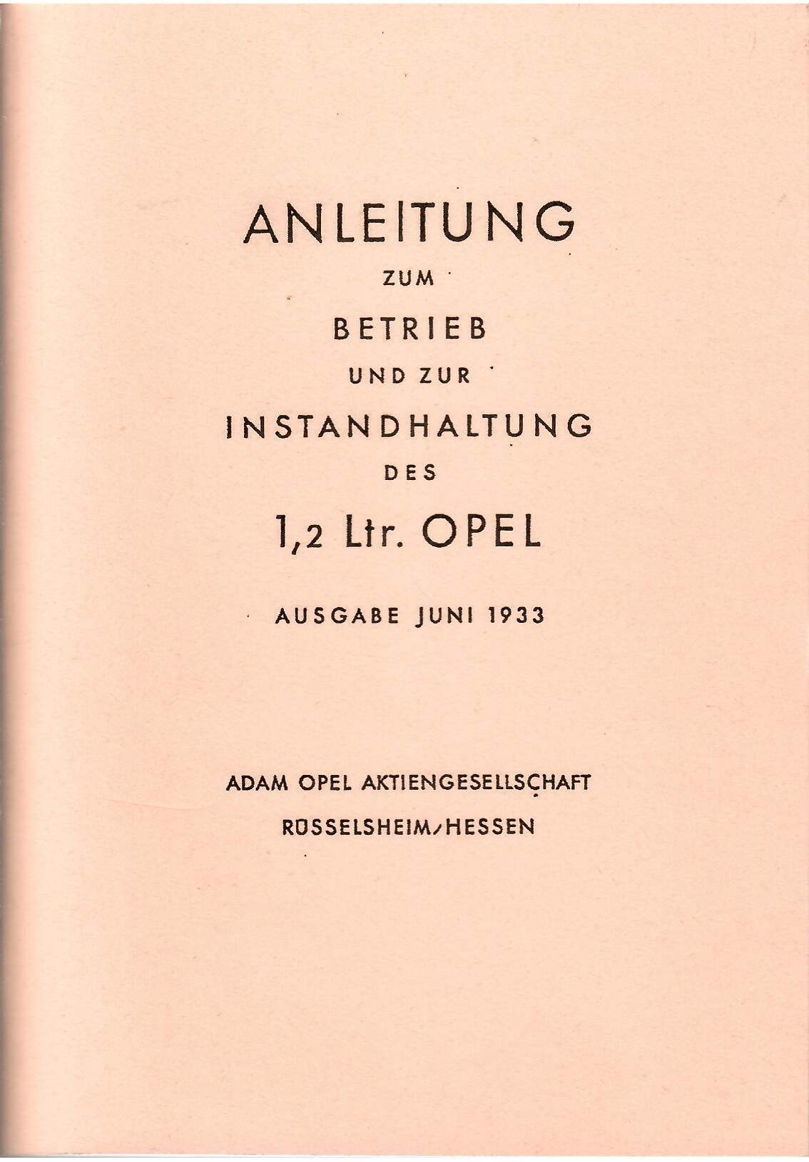 Bedienungsanleitung Opel 1,2 Ltr Opel Bedienung, Wartung, Pflege, technische Daten Mit Schmierplan Ausgabe Juni 1933 ca 90 Seiten A 5 Nachdruck