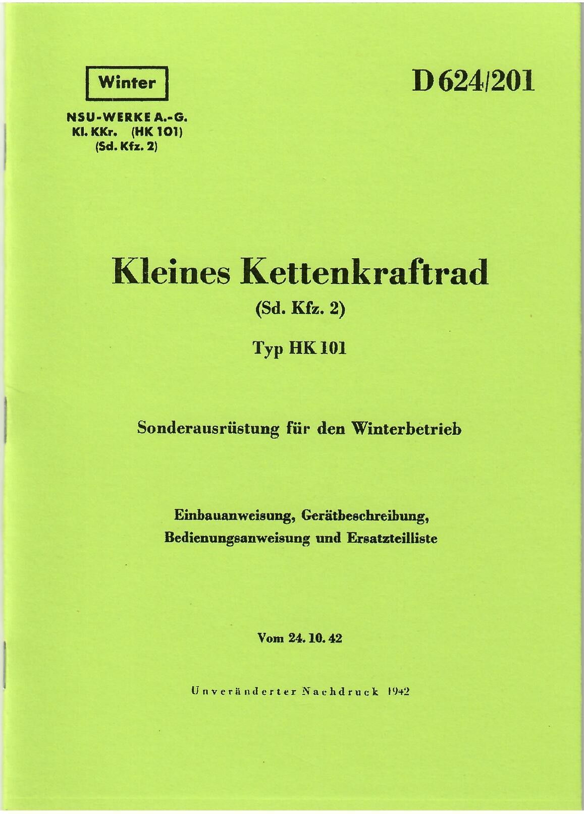 Bedienungsanleitung und Ersatzteilliste NSU Kettenkrad HK 101 Sonderausrüstung für Winterbetrieb WH-Nr. D 624 201 Ausgabe 10 1942 ca 50 Seiten A 5 Nachdruck
