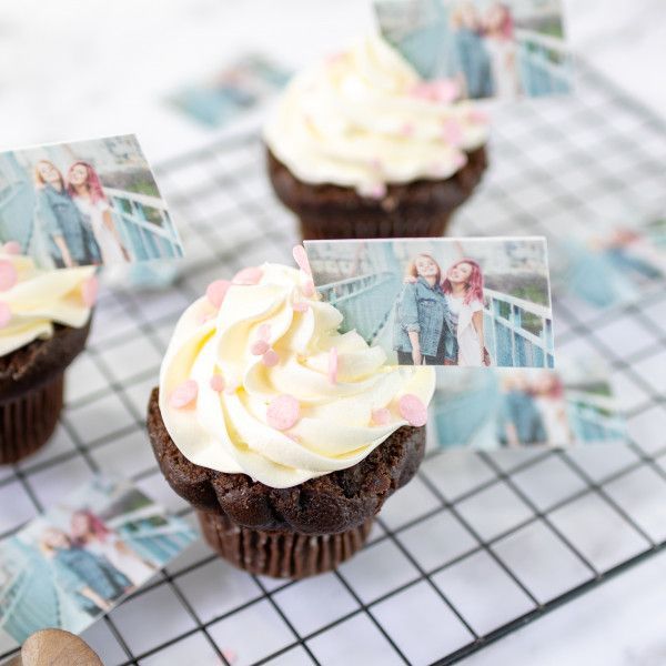 Bedruckte Oblaten rechteckig 5,0 cm x 4,0 cm - 25 Stück. Gestalten Sie Muffins, Cupcakes, Törtchen und viele weitere Leckereien mit individuell bedruckten Oblaten. Unsere bedruckten Oblatenaufleger können mit Fotos, Logos, Zeichen oder Texten gestaltet werden. Egal ob zum Geburtstag, Kommunion, Jubi