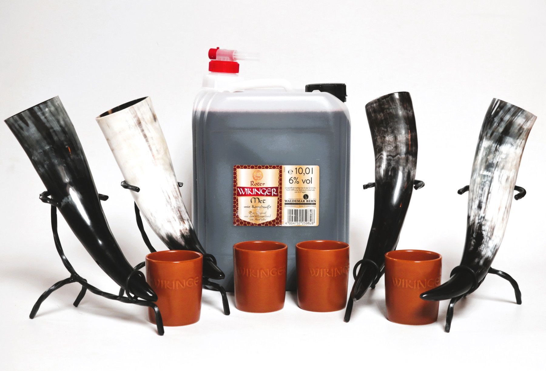Behn Wikinger Roter Met Honigwein 6% 10 l + 4 Hörner + Ständer + 4 Tonkrüge + Hahn