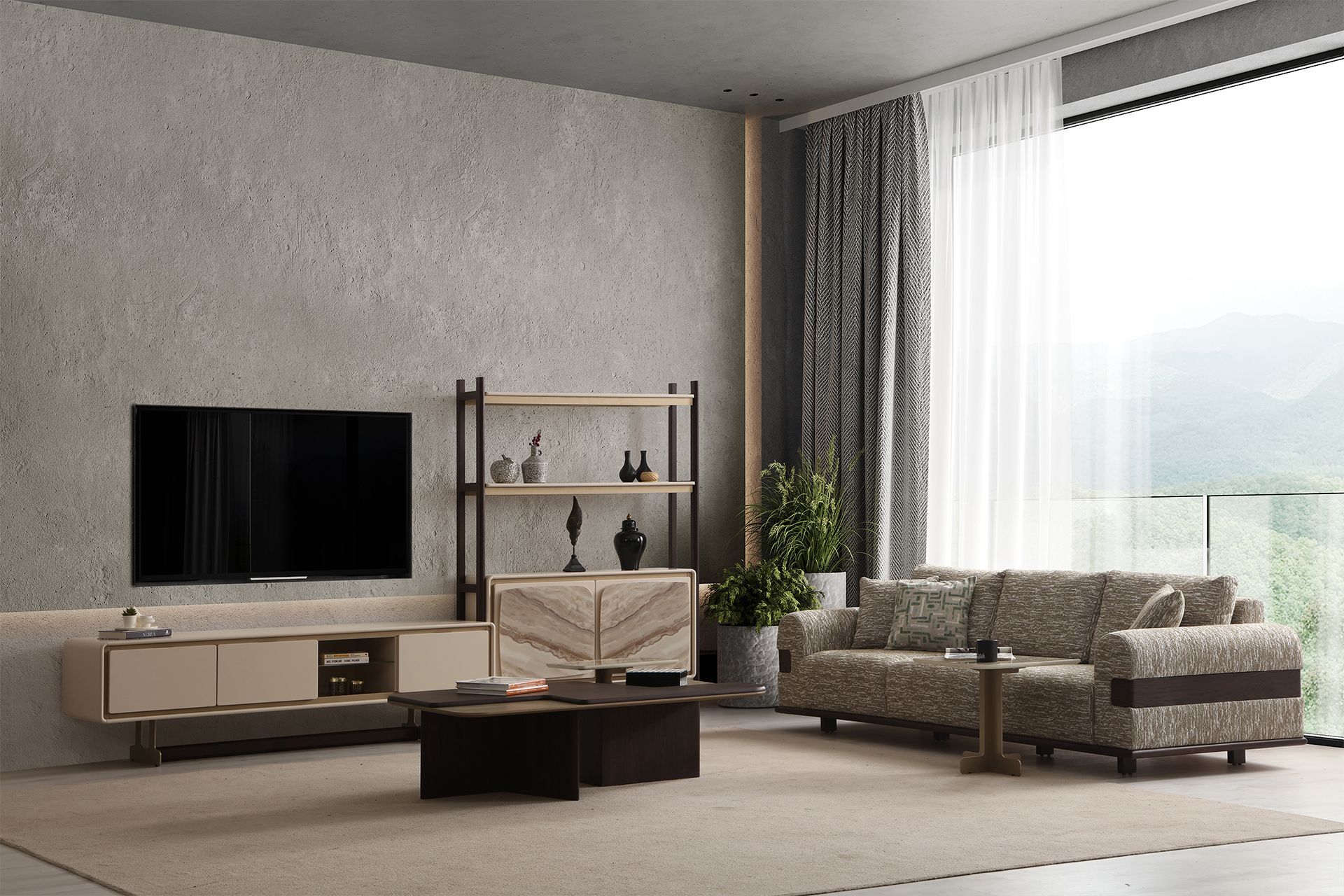 Beige Wohnzimmer Sitzgarnitur TV-Ständer Couchtisch Polstersofa