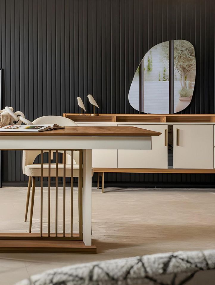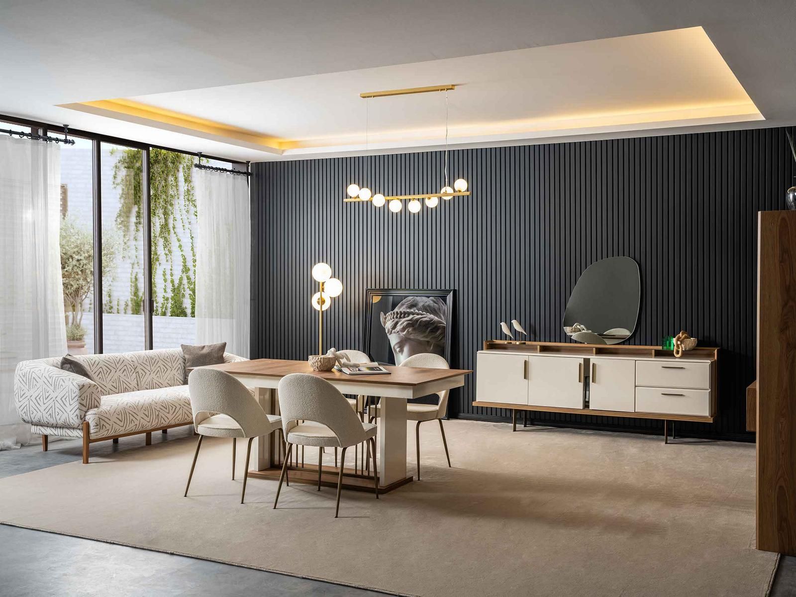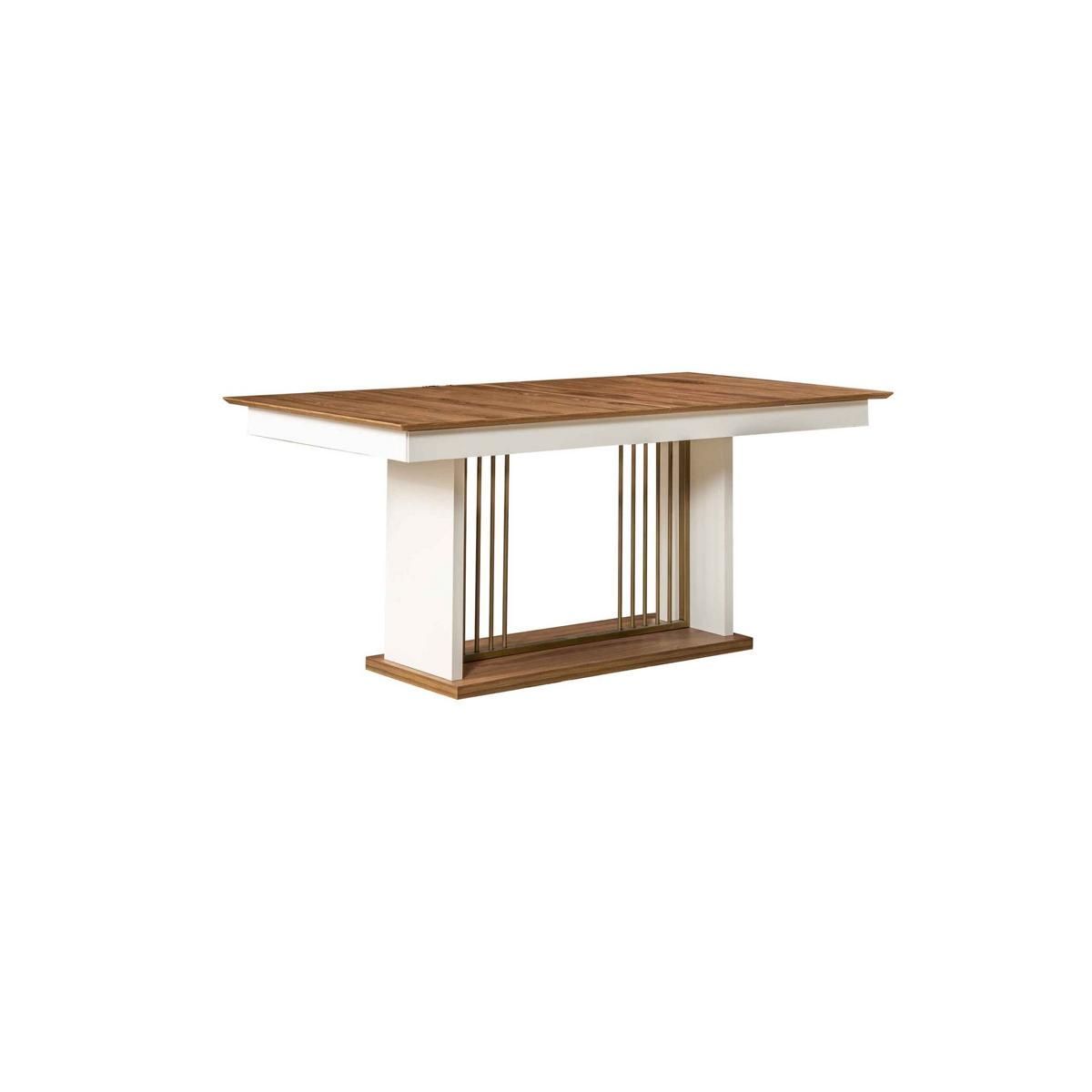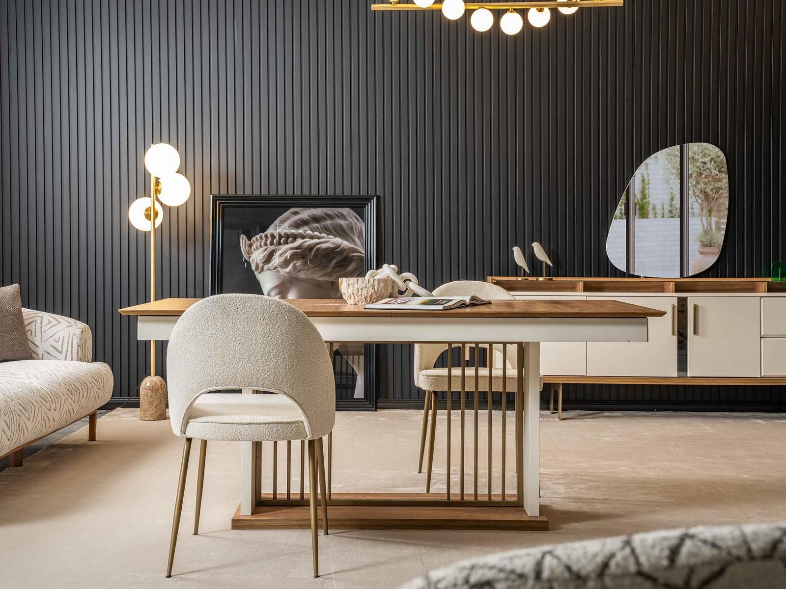 Beiges Esszimmer Set Rechteckiger Holztisch Designer 4x Polsterstühle