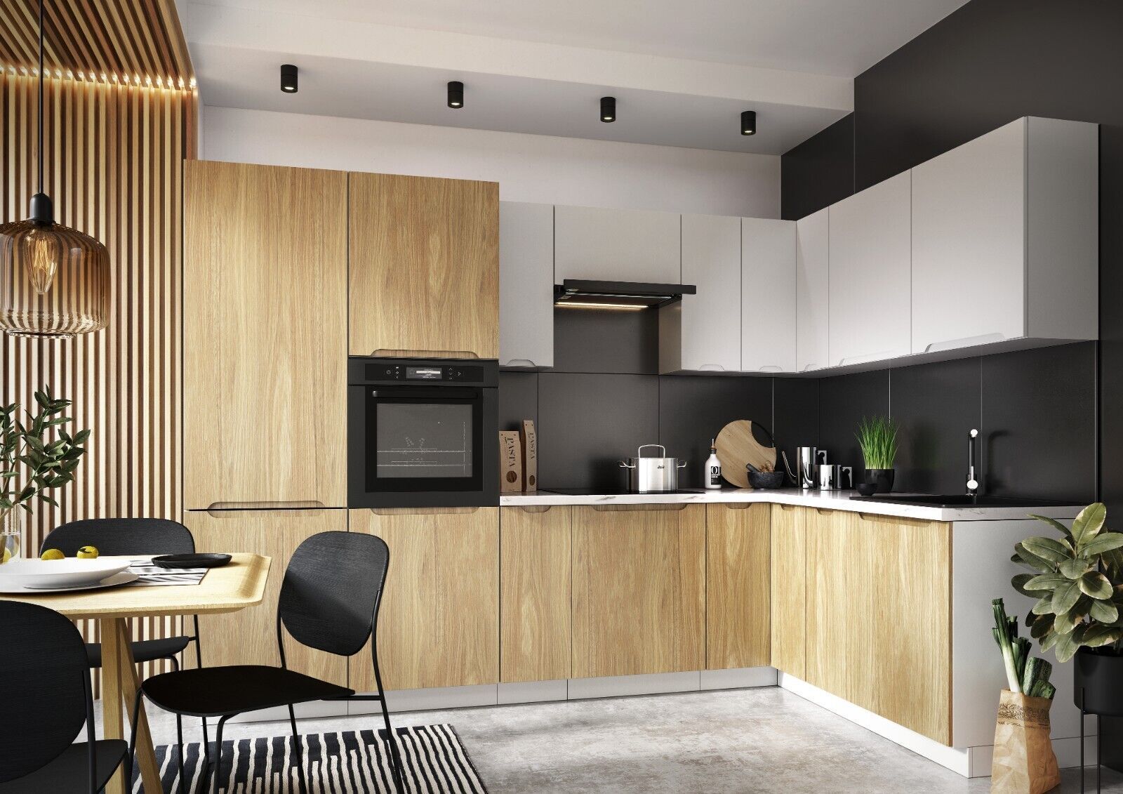 Beispiel Küche Eiche Halifax hellgrau matt Griffmulden Softclose Schubladen