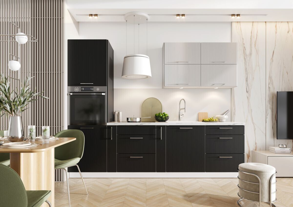 Beispiel Küche erweiterbar gefräste schwarz graue MDF Fronten Softclose Schubladen