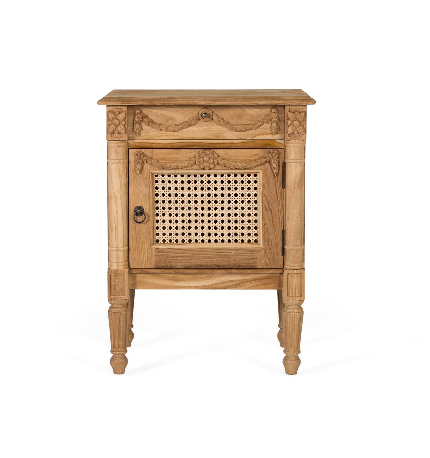 Dieser Beistelltisch ist aus massivem Teakholz gefertigt und mit einer natérlichen Oberfläche versehen, die die Maserung und den warmen Farbton des Holzes hervorhebt. Er verfégt éber eine Schublade mit dekorativen Girlanden-Schnitzereien und eine untere Tér mit einem geflochtenen Rattangitter, das v