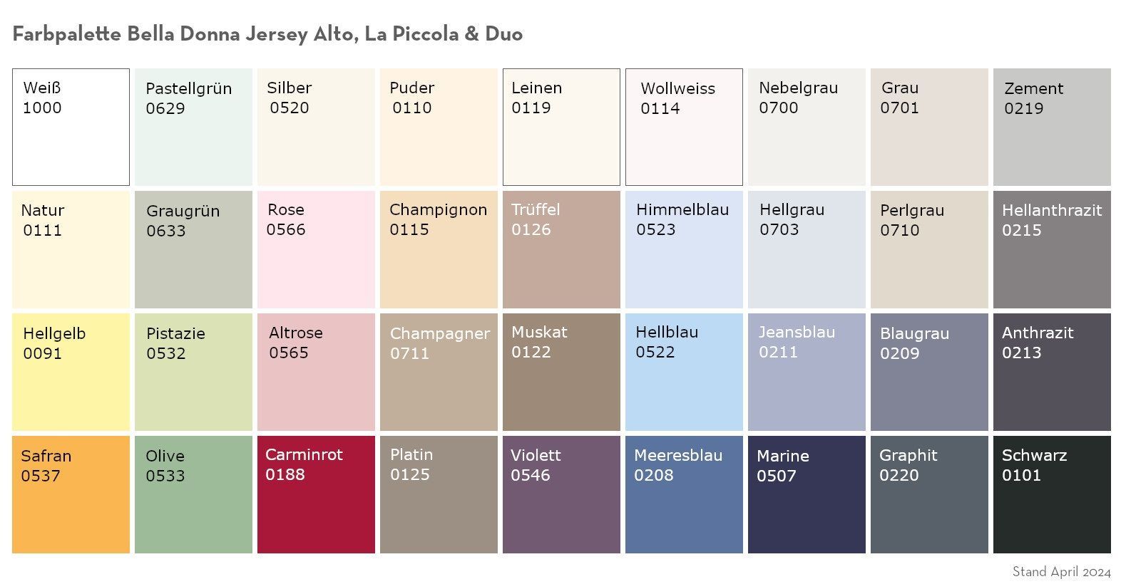 1000 weiss, 0629 pastelgrün, 0520 silber, 0110 puder, 0119 leinen, 0114 wollweiss, 0700 benlgrau, 0701 grau, 0219 zement