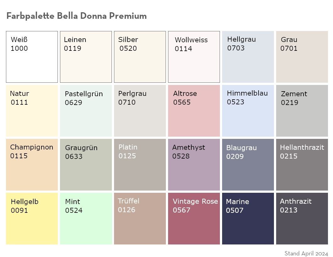 1000 weiß, 0119 leinen, 0520 silber, 0114 wollweiss, 0703 hellgrau, 0701 grau, 0111 natur, 0629 pastellgrün, 0710 perlgrau