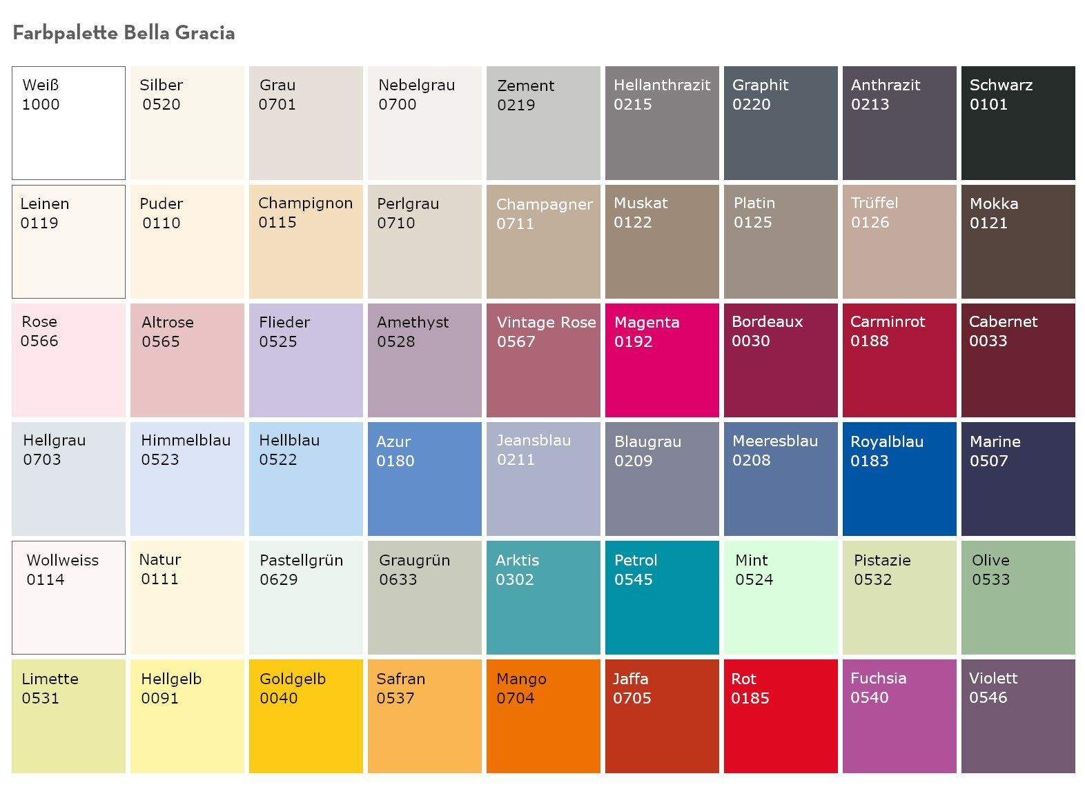 0030 Bordeaux, 0033 Carbernet, 0040 Goldbelb, 0091 Hellgelb, 0101 Schwarz, 0110 Puder, 0111 Natur, 0114 Wollweiss, 0115 Champion