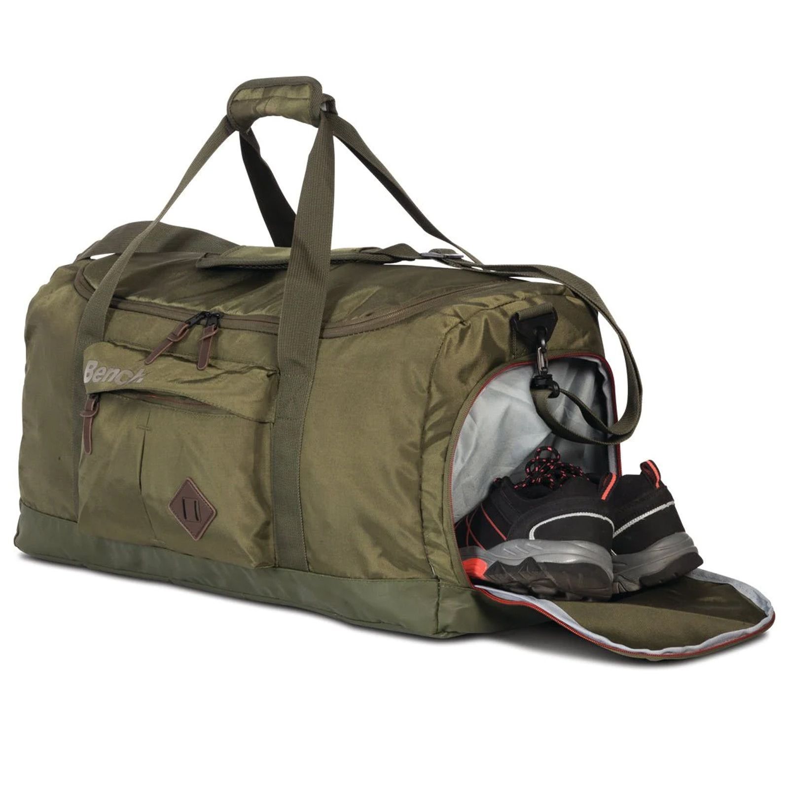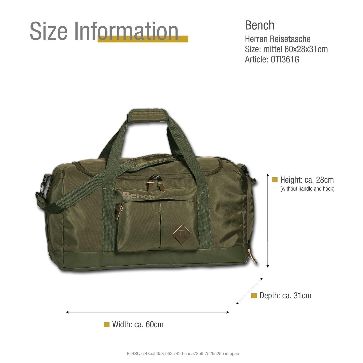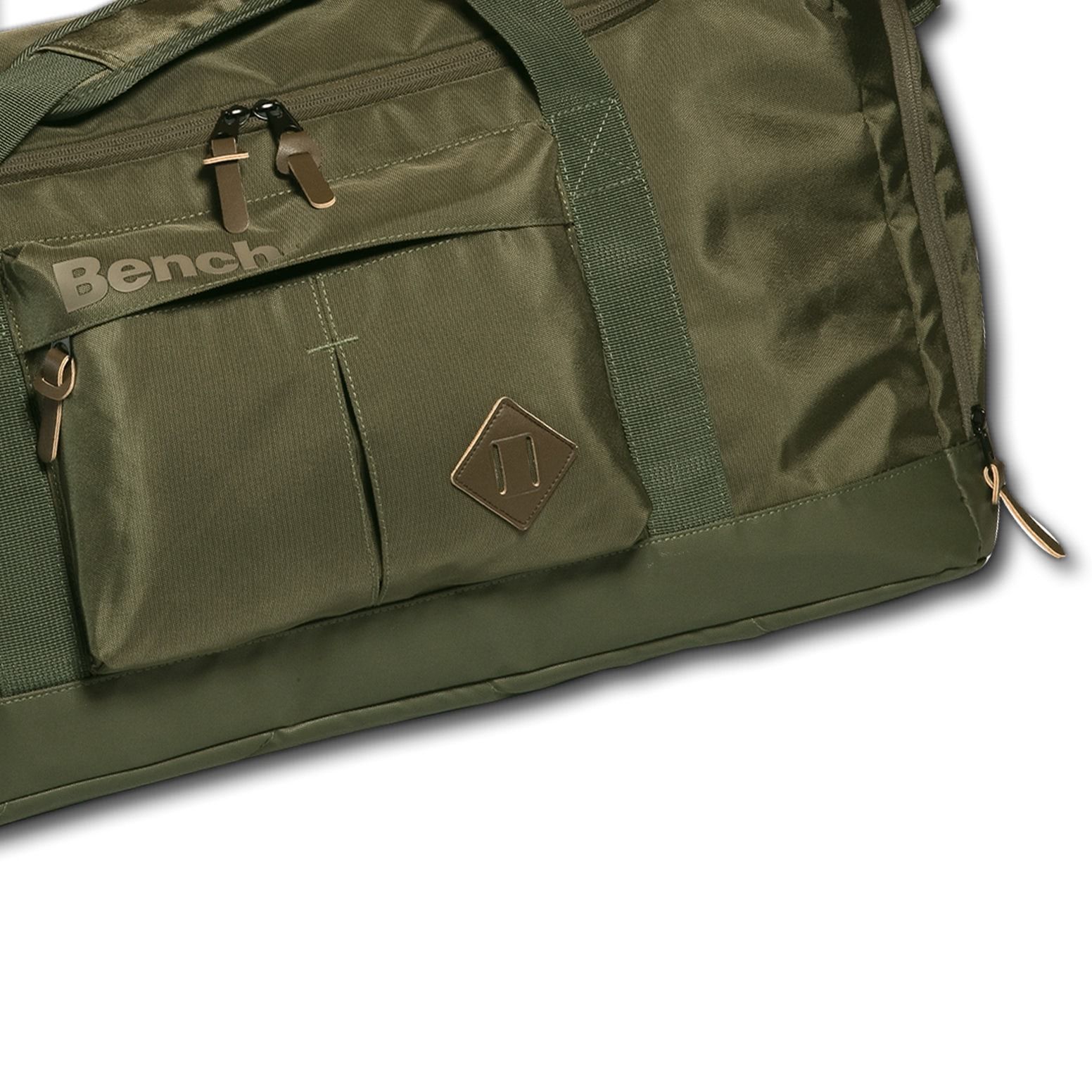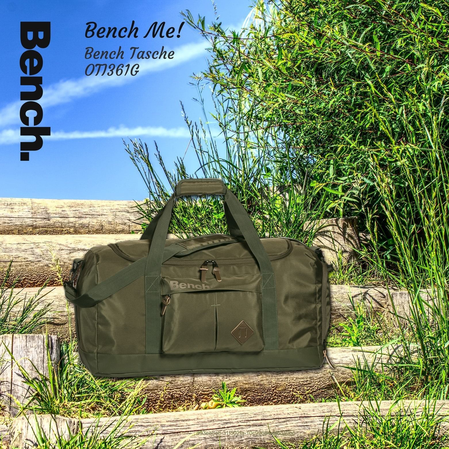 Hier ist eine wunderschöne Bench Marken-Reisetasche Sporttasche für Herren Damen Jugend in der Farbe olivgrün grün. Diese trendige Tasche aus der Bench Classic Kollektion ist aus Nylon reversed Polyester und wird mit Reißverschluss verschlossen.