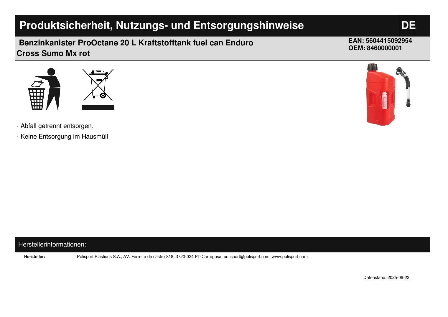 Polisport Benzinkanister ProOctane 20 L Kraftstofftank fuel can Enduro Cross Sumo Mx rot