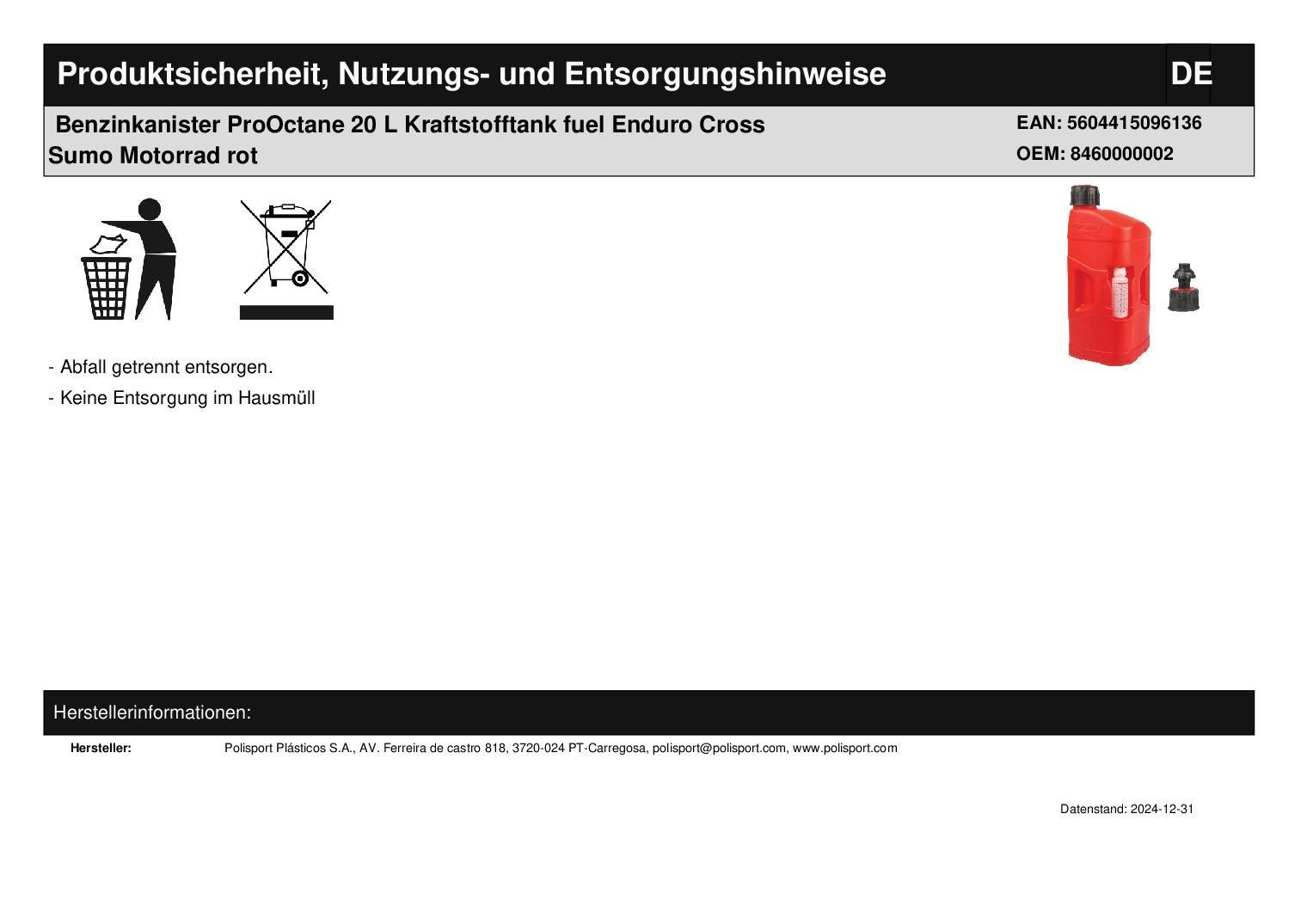 Polisport Benzinkanister ProOctane 20 L Kraftstofftank fuel Enduro Cross Sumo Motorrad rot