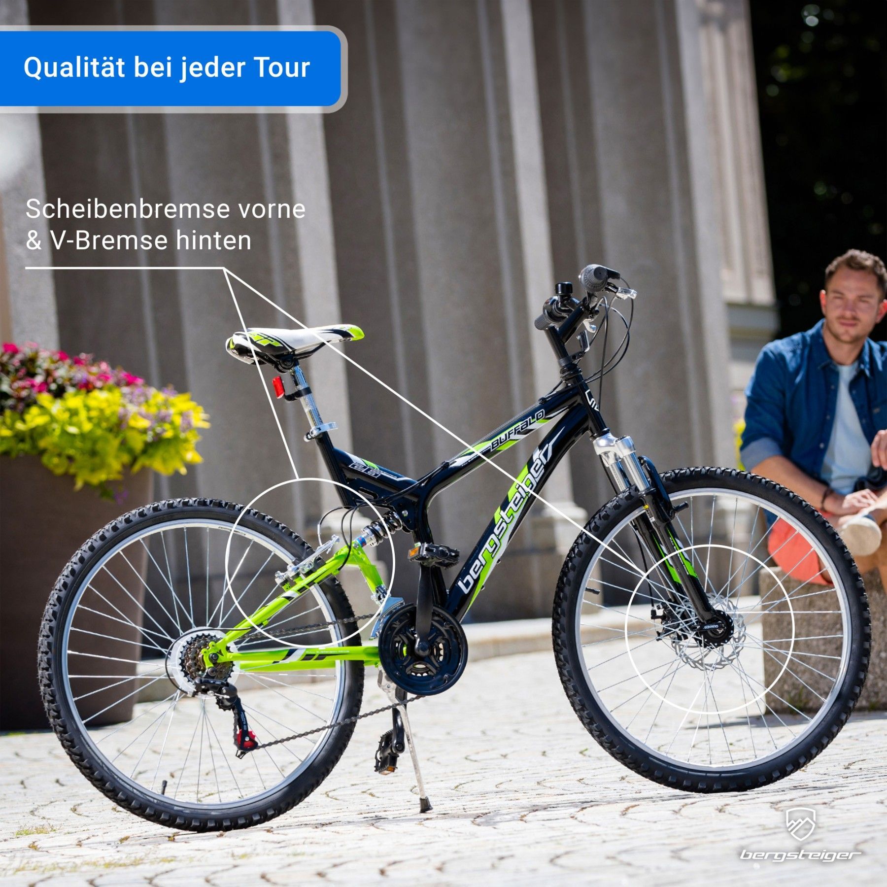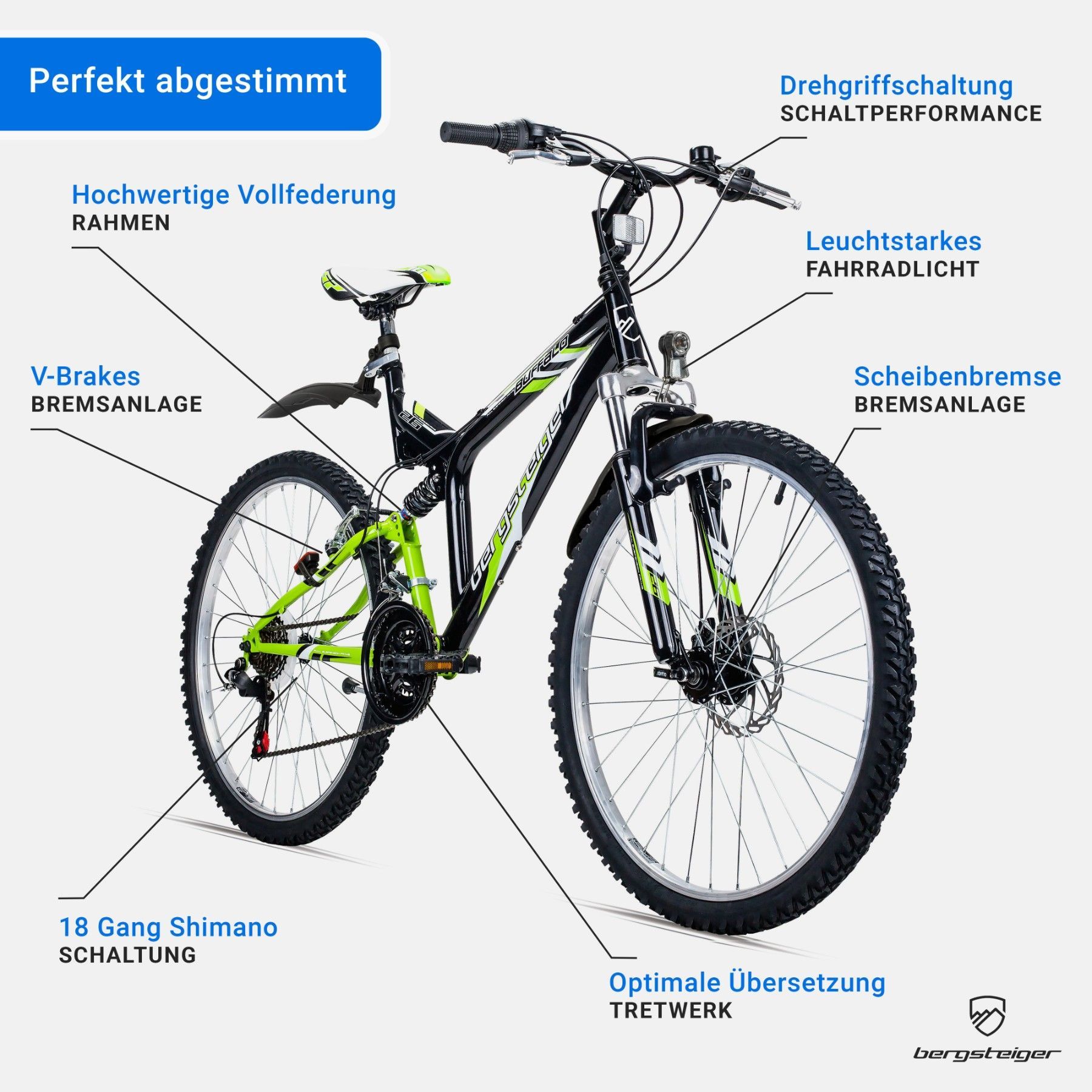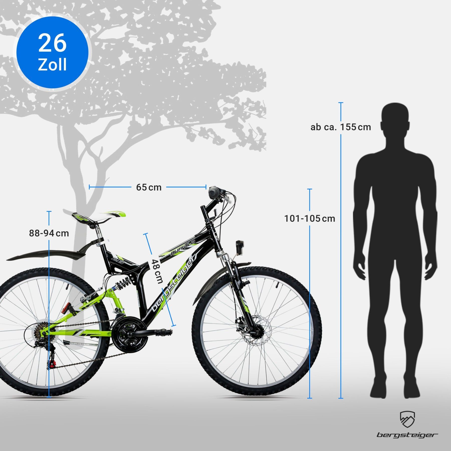 Bergsteiger Buffalo 26 Zoll Mountainbike, geeignet ab 155 cm, Scheibenbremse, Shimano