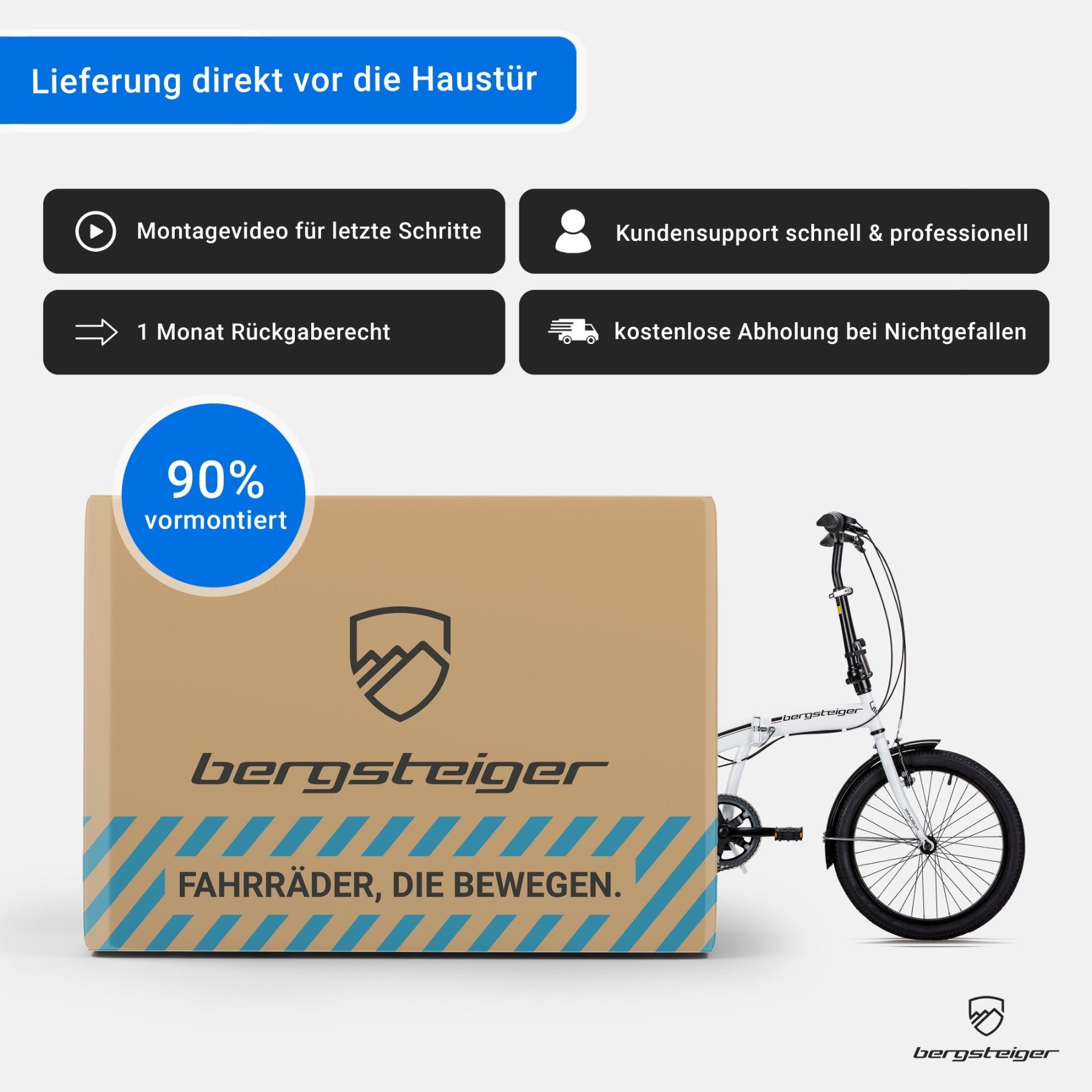 Die Verpackung war super! Die Restmontage war für mich problemlos - ging ohne die Anleitung. Das Faltrad läßt sich gut zusammen und wieder auseinander klappen. Die Verriegelungen funktionieren gut. Man muß nur etwas auf die Stellung der Pedale achten, damit das Fahrrad dann auch auf dem Bügel richtig steht und nicht auf einem Pedal. Geht auch, kann aber auch umfallen... Die Sattelhöhe hätte ich gern etwas höher. Die Schaltung funktioniert einwandfrei. Die Beleuchtung mit Batterien geliefert: Prima! Die Lage der Bremshebel gefällt mir ergonomisch nicht so gut. Aber da ich das Rad nur für kurze Strecken nutze, ist das für mich o.k. Im großen und ganzen gefällt mir das Faltrad gut!