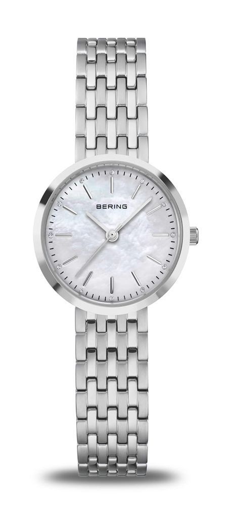 klassische zierliche Armbanduhr im typisch minimalistisch nordischen Design von Bering - glänzendes Edelstahlgehäuse, glänzend und mattes Edelstahl-Metallband, Druckfaltschließe, kratzbeständiges Saphirglas, 5 ATM wasserdicht
