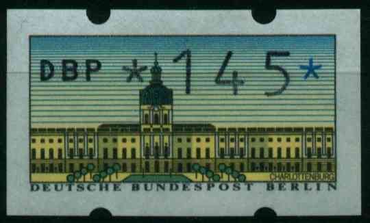 BERLIN ATM 1987 Nr 1-145R postfrisch 145 Pfg Wert aus der ATM-Ausgabe von 1987, mit rückseitiger Nummer 1.79€ incl. MwSt: Differenzbesteuert zzgl. Versandkosten Bestell-Nr.: S384B22 Katalog-Nr: MICHEL (ATM 1-145R) Katalogpreis: 4,95 EUR Qualität: Normal Erhaltung: Postfrisch ** Einheit: Einzelm