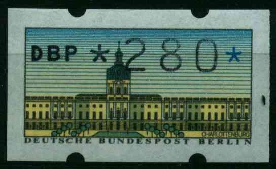 BERLIN ATM 1987 Nr 1-280 postfrisch 280 Pfg Wert aus der ATM-Ausgabe von 1987 1.25€ incl. MwSt: Differenzbesteuert zzgl. Versandkosten Bestell-Nr.: S7723DA Katalog-Nr: MICHEL (ATM 1-280) Katalogpreis: 4,52 EUR Qualität: Normal Erhaltung: Postfrisch ** Einheit: Einzelmarke Einzelstück Bogenlage: