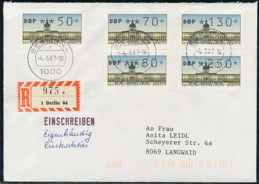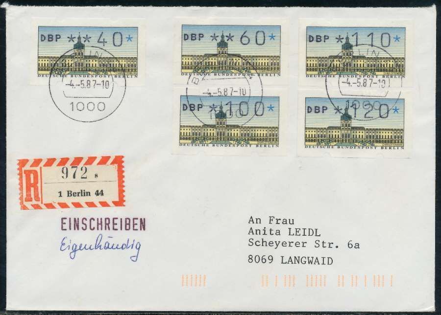 BERLIN ATM Nr VS1-10-300 EST BRIEF FDC ATM-Ausgabe von 1987, Werte wie aus dem Versandstellen Satz VS1, verteilt auf 3 Briefe, jeweils mit Ersttagsstempel, Einschreiben, Eilboten, Eilzustellung, Eigenhändig, Rückschein 28.36€ incl. MwSt: Differenzbesteuert zzgl. Versandkosten Bestell-Nr.: 7E472