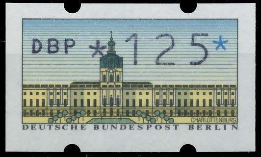 BERLIN AUTOMATENMARKEN Nr ATM 1-125 postfrisch 125 Pfg Wert aus der ATM-Ausgabe von 1987 1.52€ incl. MwSt: Differenzbesteuert zzgl. Versandkosten Bestell-Nr.: S4A774E Katalog-Nr: MICHEL (ATM 1-125) Katalogpreis: 3,13 EUR Qualität: Normal Erhaltung: Postfrisch ** Einheit: Einzelmarke Einzelstück