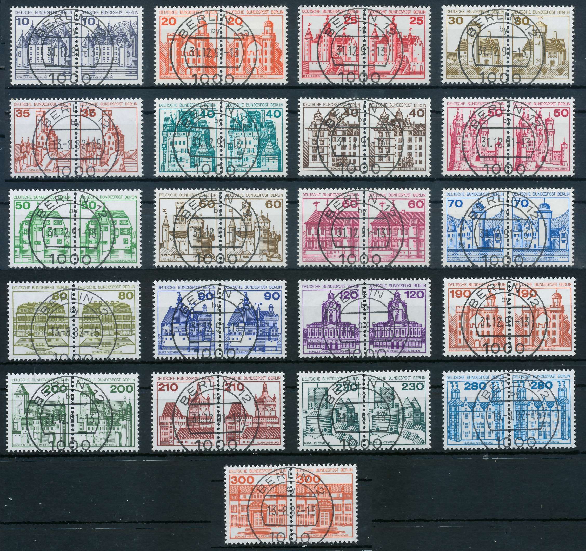 BERLIN DS BURGEN U. SCHLÖSSER Nr 532-WP-677-WP Ausgabe Burgen und Schlösser kompletter Satz in waagrechten Paaren (21 Werte), einheitlich Berlin 12, meist mit Letzttagsstempel 31.12.91 84.25€ incl. MwSt: Differenzbesteuert zzgl. Versandkosten Bestell-Nr.: 7FDE76 Katalog-Nr: MICHEL (532 -WP - 67