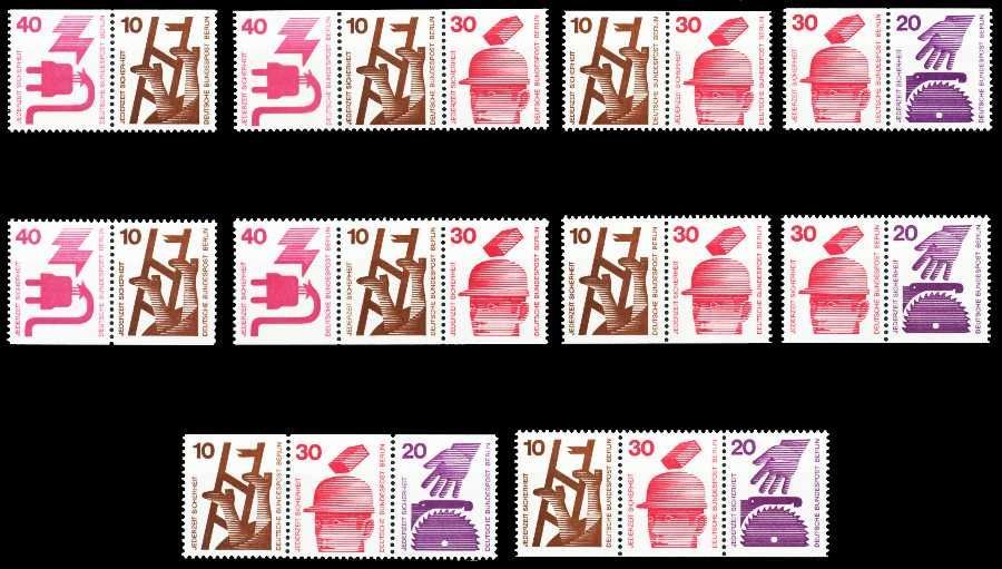 BERLIN ZUSAMMENDRUCK Nr W51-W60 postfrisch Zusammendrucke aus Unfallverhütung Berlin C D - oben und unten geschnitten (MichelNr.: 403C D, 404C D, 406C D, 407C D) 30.25€ incl. MwSt: Differenzbesteuert zzgl. Versandkosten Bestell-Nr.: S395B52 Katalog-Nr: MICHEL (W51 - W60) Katalogpreis: 84 EUR Qu