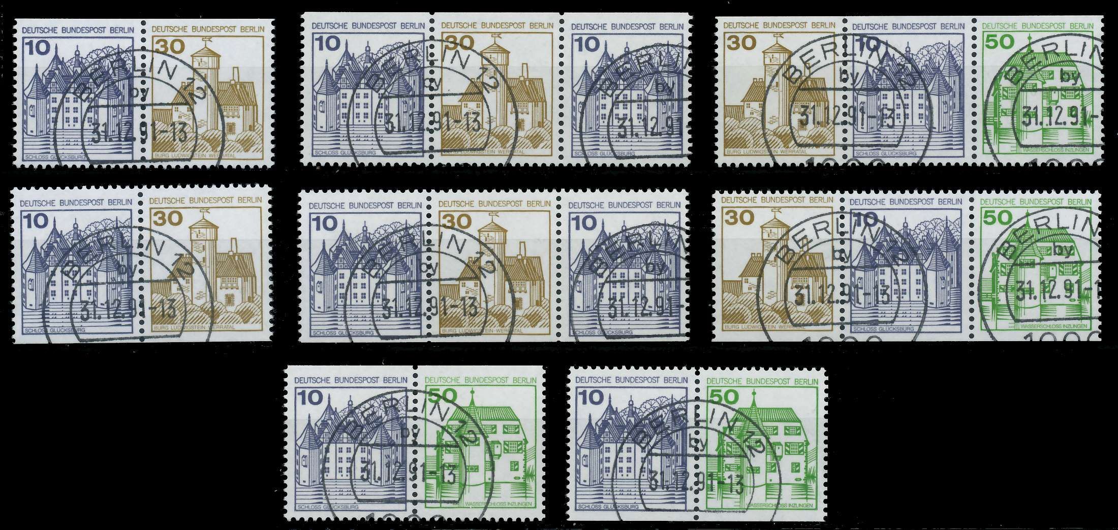 BERLIN ZUSAMMENDRUCK Nr W67-W74 zentrisch gestempelt Zusammendrucke Burgen und Schlösser Berlin aus Heftchenblatt 19, einheitlich Berlin 12, 31.12.1991 = Letzttagsstemnpel, (MichelNr.: 19, 532C D, 534C D, 615C D) 27.01€ incl. MwSt: Differenzbesteuert zzgl. Versandkosten Bestell-Nr.: 7FDE52 Kata