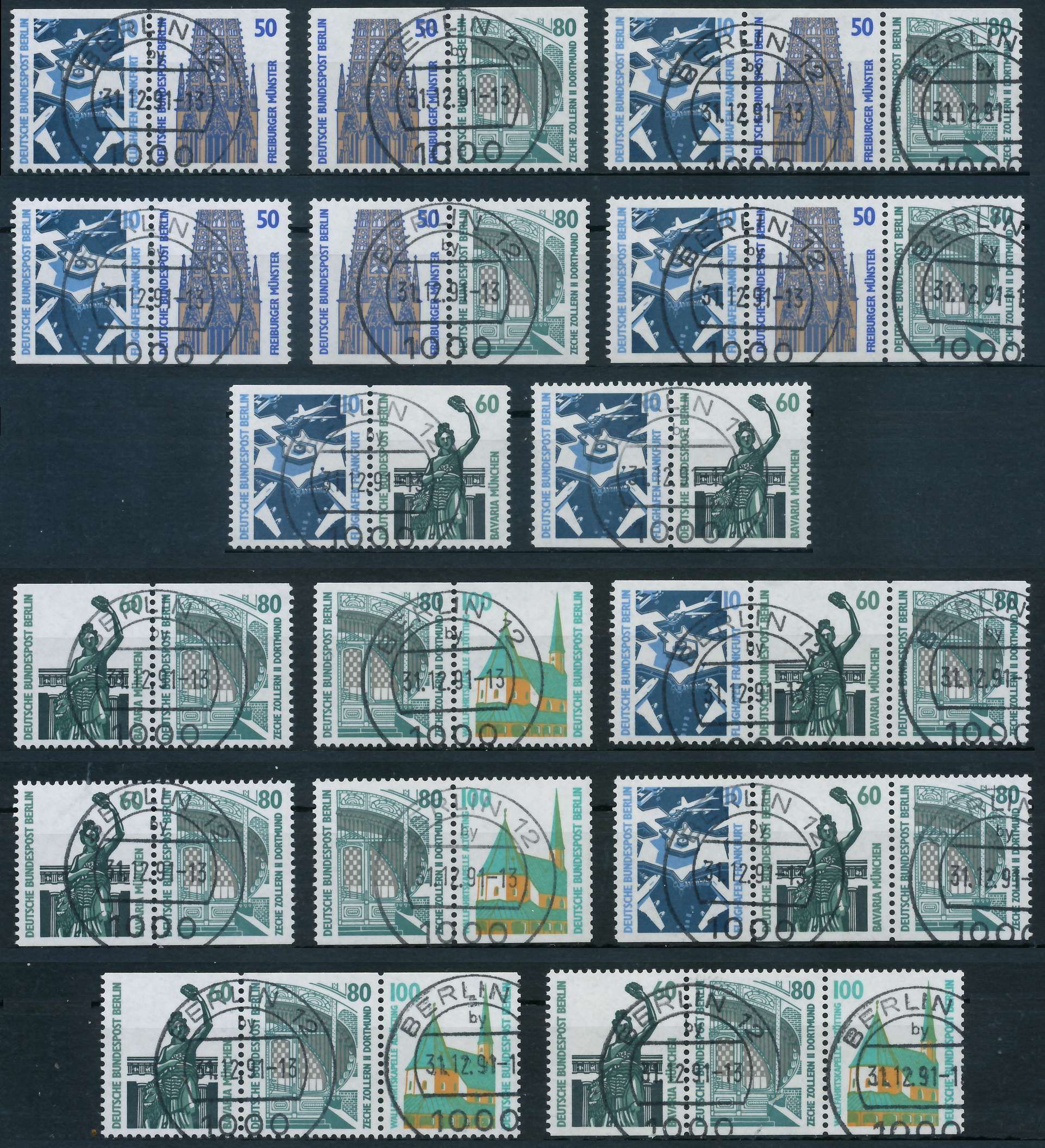 BERLIN ZUSAMMENDRUCK Nr W83-W98 zentrisch gestempelt Zusammendrucke Sehenswürdigkeiten Berlin komplett, alle einheitlich zentrisch mit Berlin 12 31.12.91 = Letzttagsstempel, alle mit vollständiger Gummierung (MichelNr.: 794C D, 795C D, 796C D, 798C D, 834C D) 386.11€ incl. MwSt: Differenzbesteu