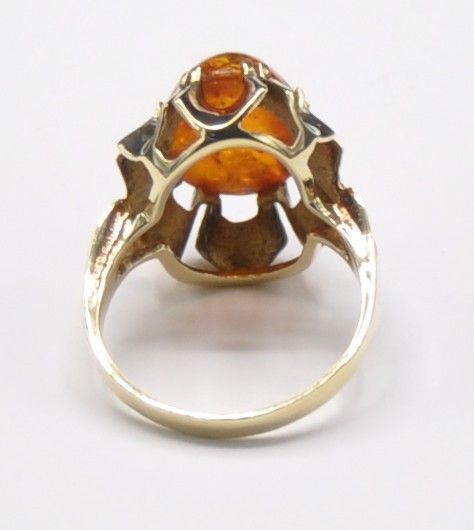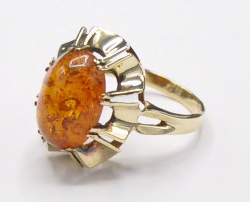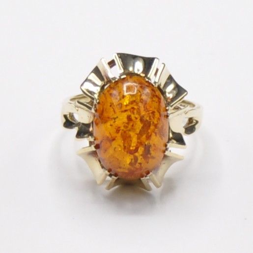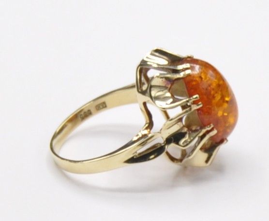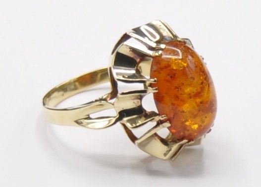 Der Ring ist stabil und solide gearbeitet und wiegt 4 Gramm. Der Bernstein ist komplett Kratzerfrei. Die Kopfbreite ist 1,8 cm. Der Ring hat einen Innendurchmesser von 1,68 cm und ist 585 gestempelt.