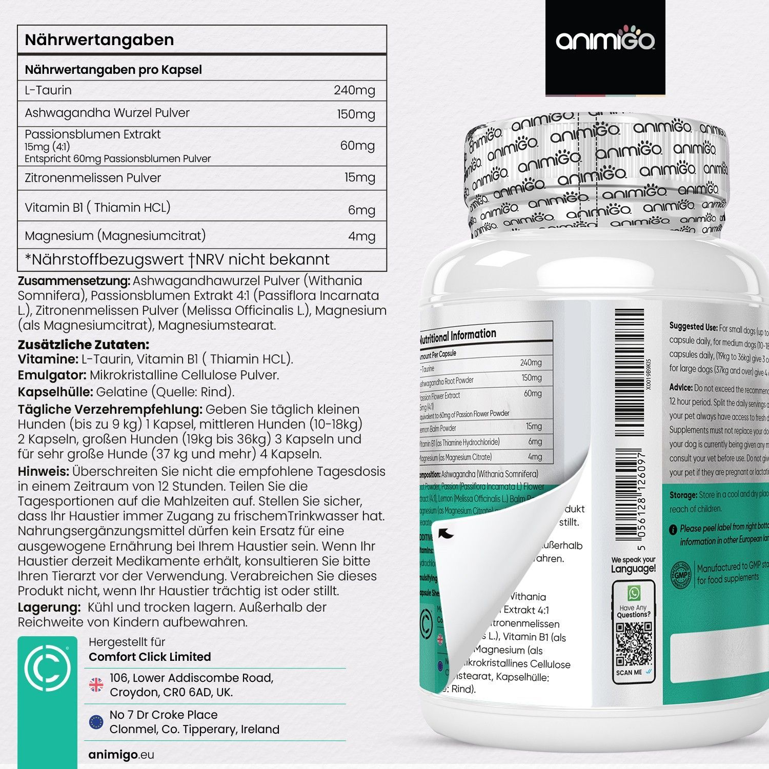Beruhigungsmittel für Hunde - 120 Entspannung Kapseln mit Taurin - animigo